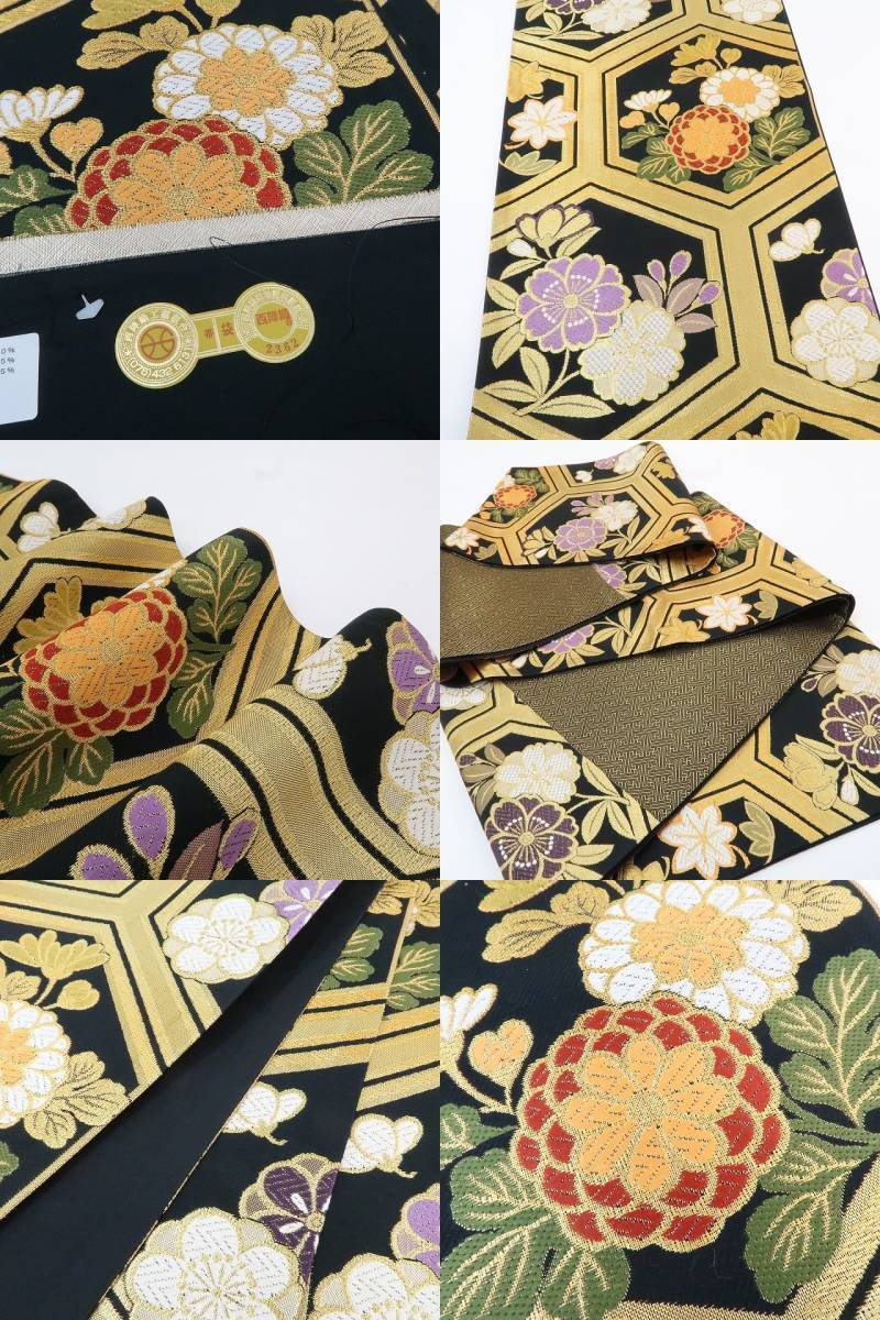高級感溢れる黒×ゴールドで大胆に亀甲を繋ぎ、菊や桜、梅、紅葉、可愛らしい横顔が顔を出し、流石「西陣織」と言える美しい息吹を上げて華やかな振袖をより華やかに盛り上げながら後ろ姿の主役となる一本は、まだ誰のものでもない“真新しい”お品物。