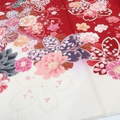 まるで花道の如く開く赤×生成り色の趣には、晴れやかに華やかに開花して一斉に翔けだす桜や牡丹、毬が“金駒刺繍”で豪華に飾った最高の笑みを際立たせて迫力を解き、これから向かう晴れ舞台の主役...そう、今目の前の貴女を連れて更に晴れやかさも華やかさも増し、歩みを加速させます。
