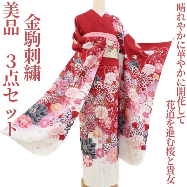 美品 3点セット 金駒刺繍 着物 成人式 正絹“晴れやかに華やかに開花して花道を進む桜と貴女”振袖・帯揚げ・帯締め 1875