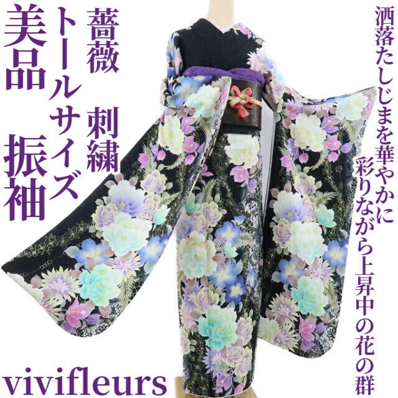 美品 vivifleurs 薔薇 刺繍 着物 正絹 成人式 トールサイズ“洒落たしじまを華やかに彩りながら上昇中の花の群”振袖 2313