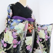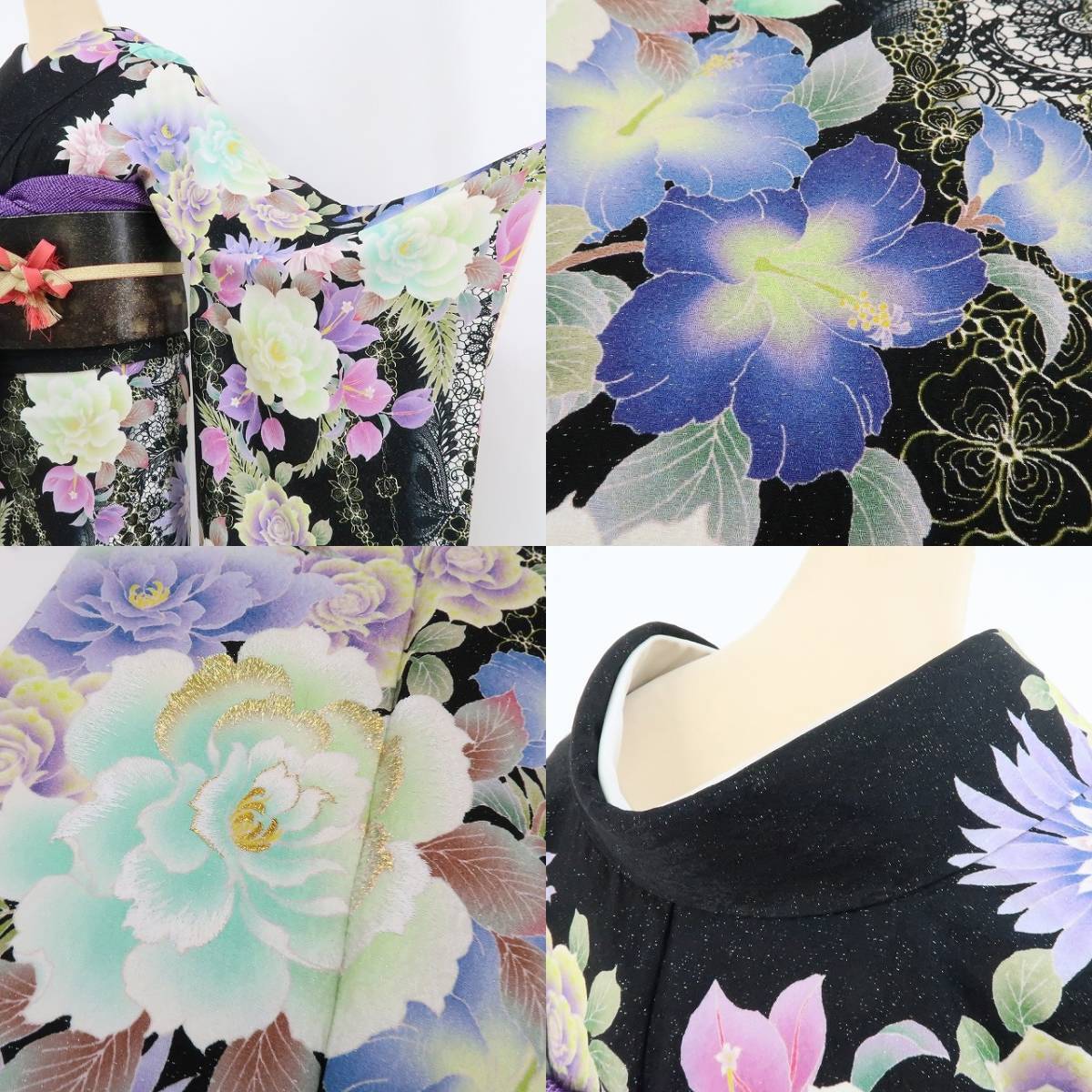 お洒落して静かな美しさに磨きをかけた黒で迎え、刺繍で晴れ化粧をした薔薇を中心うっとりする開花を魅せながら上昇、袖を通す者の美しさ、所作の一つ一つをより美しく花咲かせる、vivifleurs 薔薇“刺繍”正絹成人式トールサイズ振袖でございます。