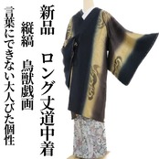 新品 縦縞 鳥獣戯画 着物“心密かに熱くなれ!言葉にできない大人びた個性”正絹 仕付け糸付 ロング丈 道中着 2556