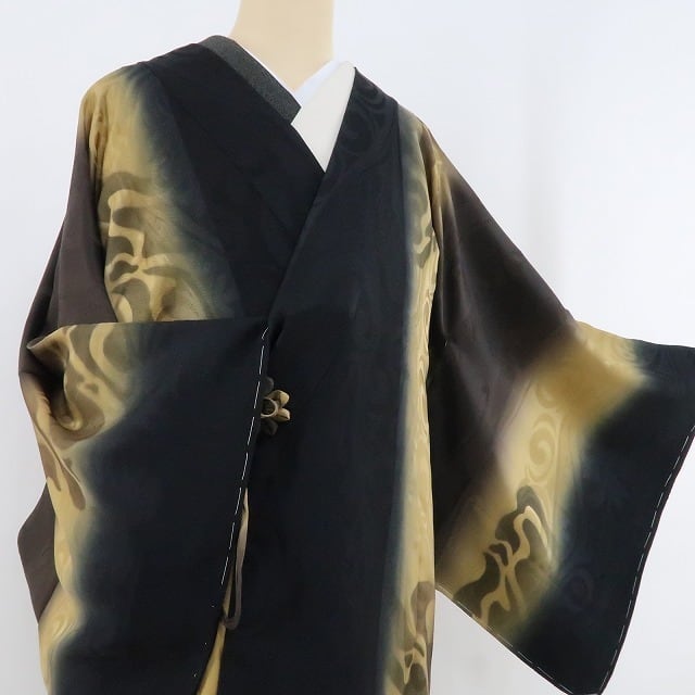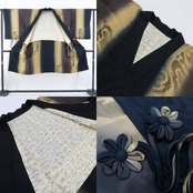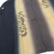縦縞状に彩られた黒・芥子色・憲法色の艶めいた濃淡、謎めいて浮かび上がるアブストラクトなデザインモチーフ、鮮烈な視覚のインパクトが醸し出すこの上ないお洒落感、そして裏地に鳥獣戯画の古典柄…蛙と兎のお道化た表情が導く“心馳せる古の旅”、素敵です。