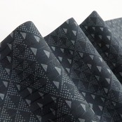 遠目には淡い光が射す縦縞、近づけば、幾何学的に広がる三つ鱗に笹が舞い降り、淡い光には何か物語が始まりそうな竹縞が紛れ、見れば見るほど知れば知るほどその巧みなセンスに感心しながら夢中になってしまう、“暈し”正絹ロング丈仕付け糸付道中着でございます。