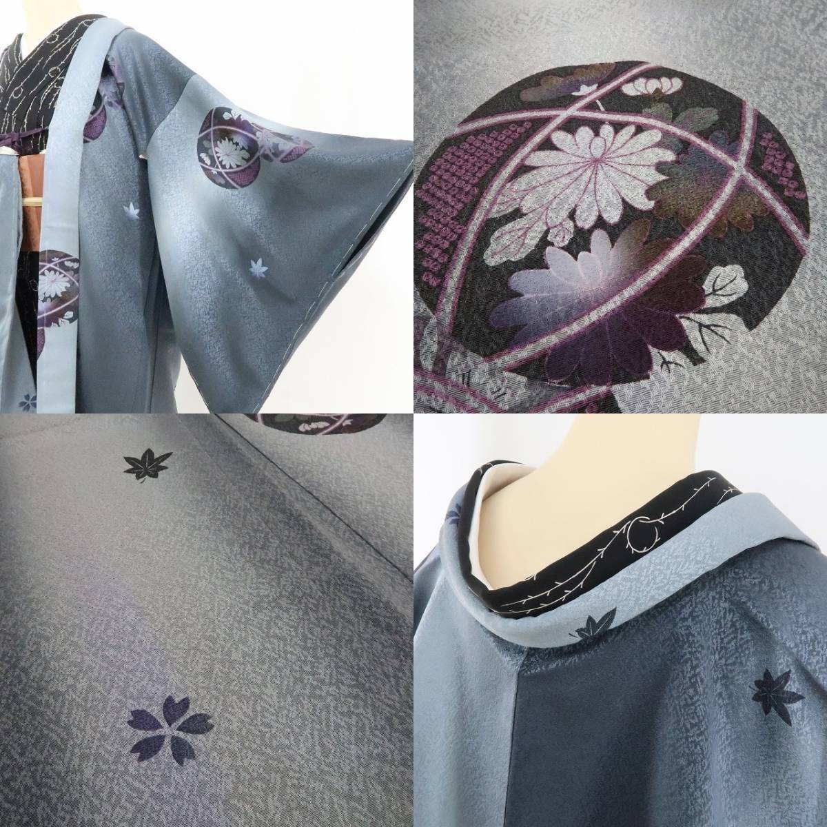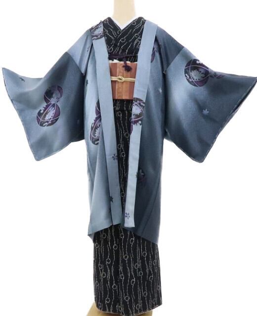 静まり返る時の中に射し込む淡い光を伝って現代へと舞い降りた絞り柄とラインでおめかしした毬、その毬に乗って風情を歌う桜や菊、紅葉が高鳴る気持ちを抑えきれずに毬から飛び出し、藍鼠色×濃いグレーで開くこの世界を引き立て、これから出会う貴女とお着物も引き立てる、東武謹製“紐付き”ロング丈 仕付け糸付長羽織でございます。