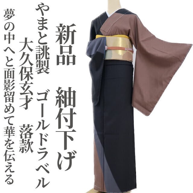 新品 やまと誂製 ゴールドラベル 大久保玄才 落款“夢の中へと面影留めて華を伝える”着物 仕付け糸付 紬付下げ 2761