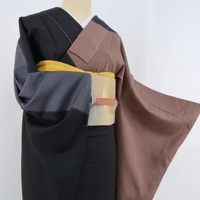 斬新な構図でまるで現代絵画のように色分けされた黒・銀煤竹色・グレーの彩色、シンプルながら紬のシャリ感に彩りの濃淡が創り出すその表情は必見!それは着物に次々と新風を吹き込む“大久保玄才”の染めの真心、卓越した技でモダンな艶を表現したひと品、正に“そめのざ玄才”たる所以が感じられるお品でございます。
