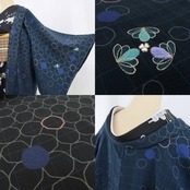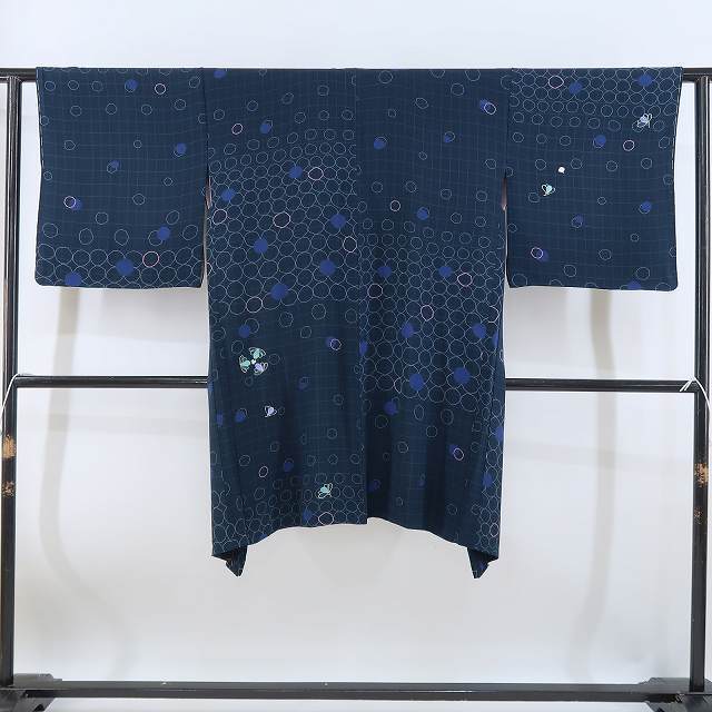 そんな想像が生まれる一面には、静かに静かに格子が広がりさり気なく色を差しながら泡のように沸き起こる味のある水玉と水中花となる花を巧みな刺繍で吹き込み、今にも飛び立ってしまいそうな躍動を見せる決して濡れることなく温かみのある水中へと誘う、“刺繍”正絹 仕付け糸付長羽織でございます。