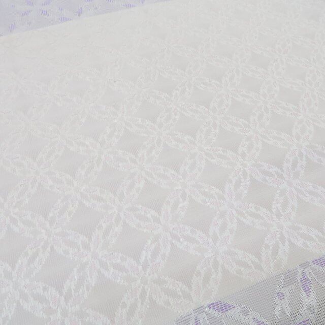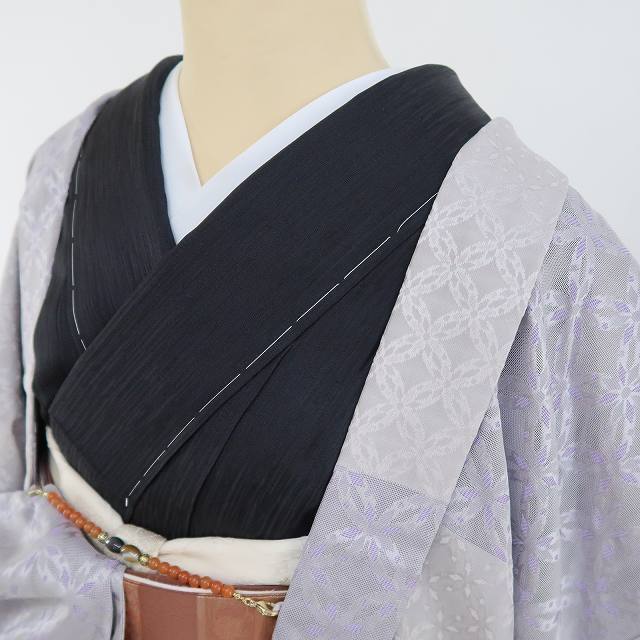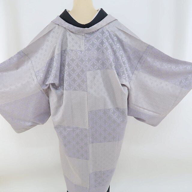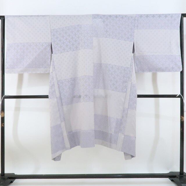 柔らかな白藤色の優彩に枡を模る横段状の濃淡、豊かな紗の透明感に浮かび上がるデザイン七宝の繋ぎ柄、丸みのフォルムが醸し出すどこか艶めいた風、季節の装いを幅広くカバーしてくれるひと品…正絹のしっとりとした生地感が着物の潤いを一段と美しく際立たせています。