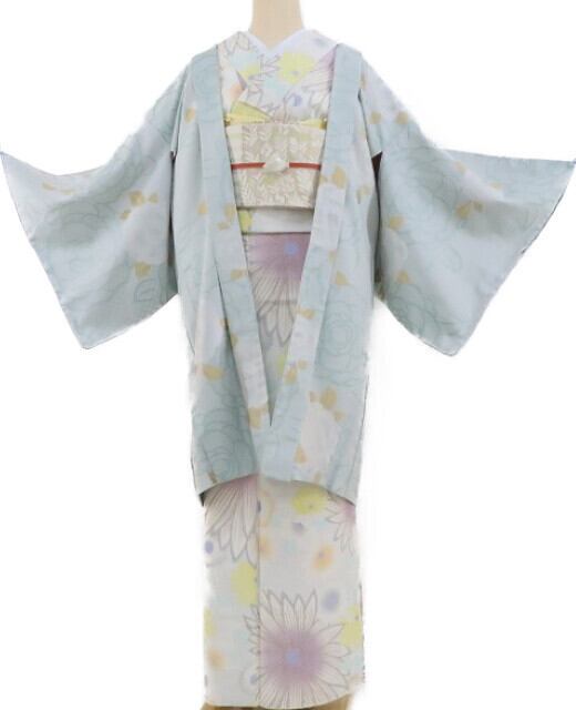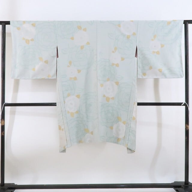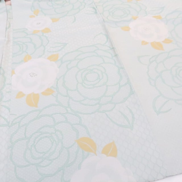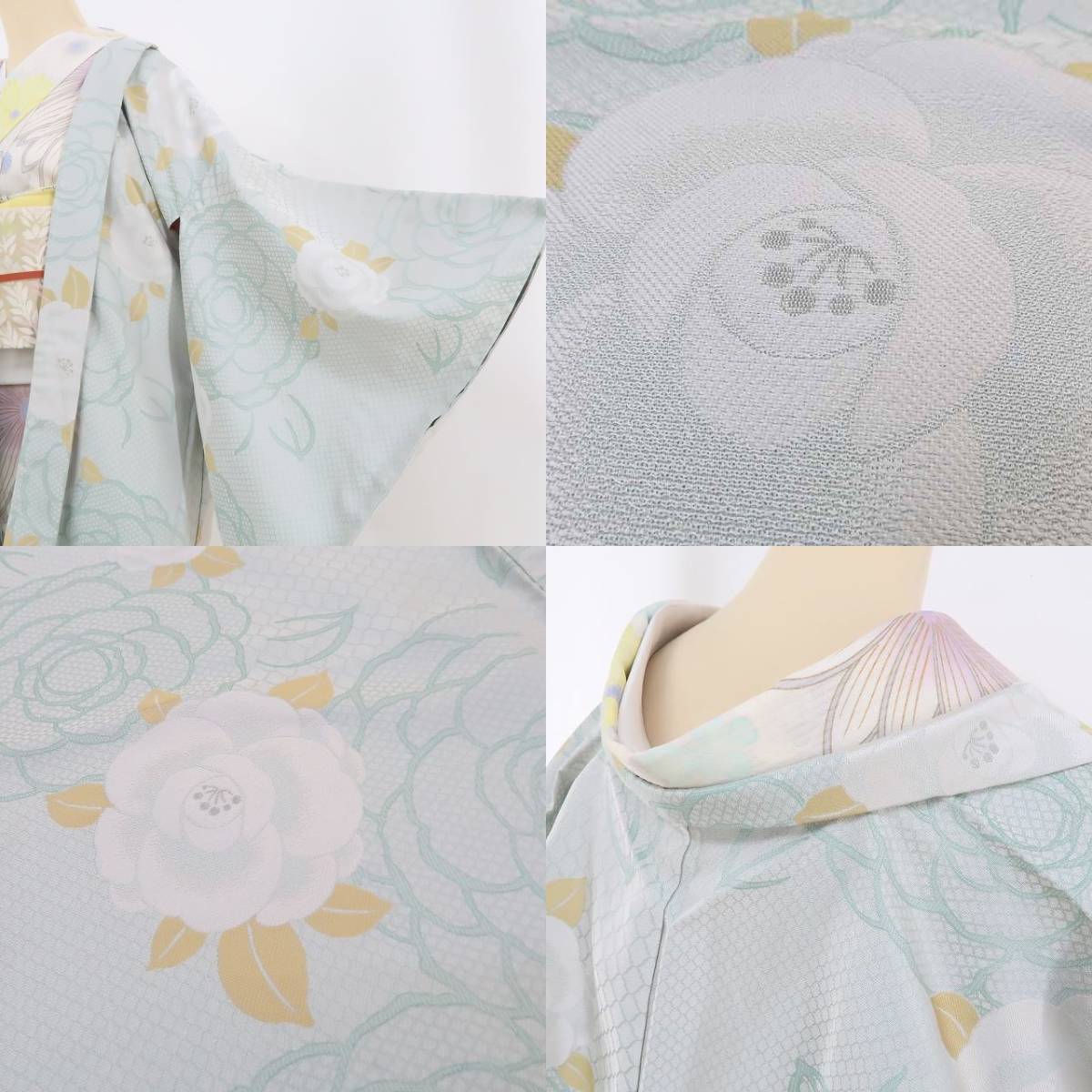 網目を広げて清々しく広がる千草鼠色に輪郭を預けて大きく微笑み、無垢な色づきで一歩前へ出る姿を見守るように優し気な雰囲気で構え、プラチナ箔を使用した格調ある美しさで棘を持たずに二つの印象で薫り立つ薔薇が大切なお着物と貴女をお守りしながらカーディガン感覚で寄り添う一枚。