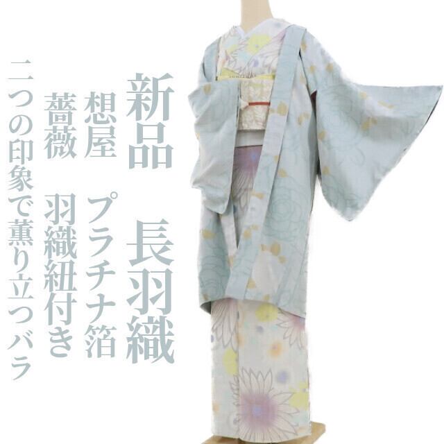 新品 想屋 プラチナ箔 薔薇 羽織紐付き 着物 正絹 仕付け糸付“二つの印象で薫り立つバラ”長羽織 2986