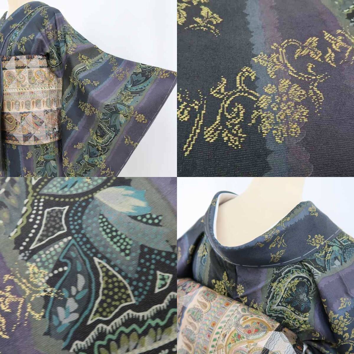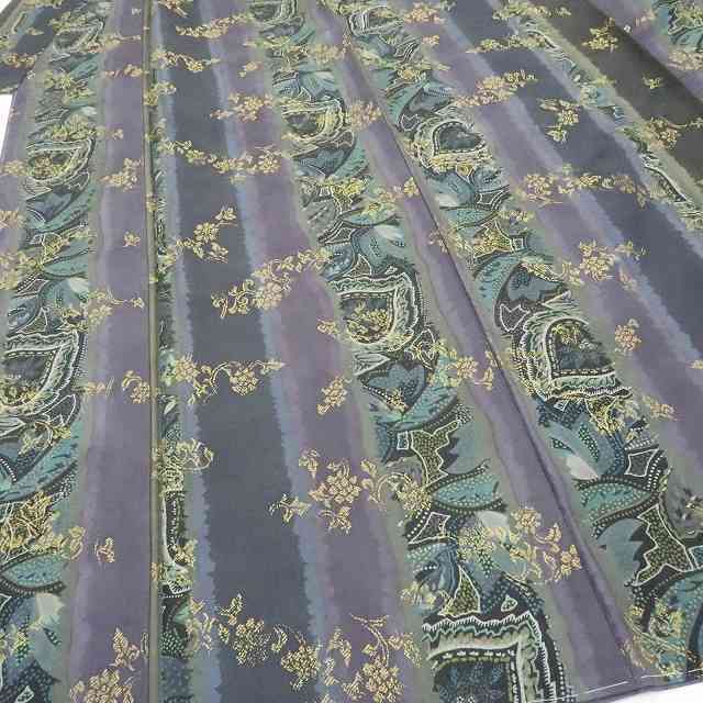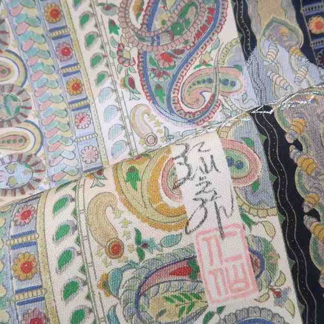 多彩な色で独特の雰囲気を解きながら広がるペイズリーに霞のようにふわりと浮かぶ鱗に有栖川、どこかエキゾチックな薫りに和モダンの風を吹かる一本は、柄の出方を気にしないつくり“全通”ですので着付けに自信のない方に心強い味方となり、急な予定が入った時にも重宝します。