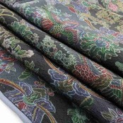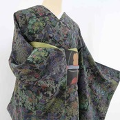 静寂を打つ黒×多彩な色で遠目には静かに構え、近づけば近づく度にそのベールを脱ぐ更紗の世界は、どこか不思議な唐花と鳳凰、菊や桜、撫子や萩の草花が独特の色づきと表情、雰囲気でただならぬ気配を巡らせて見る角度でその美しさを躍動させる、ほていや謹製 前田仁仙落款“更紗”正絹小紋でございます。