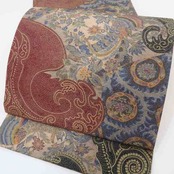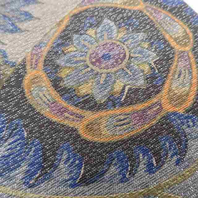他には見ない独特の世界観を解く一面には、優し気な色に不思議な薫りを漂わせる唐花や華文、鳳凰、飛沫を上げる波のような存在感と躍動を見せる繊細で優美な蔓草がその唯一無二の鼓動を響かせ、貴女の心の琴線に触れて共鳴を生む、前田仁仙落款正絹“全通”袋帯でございます。