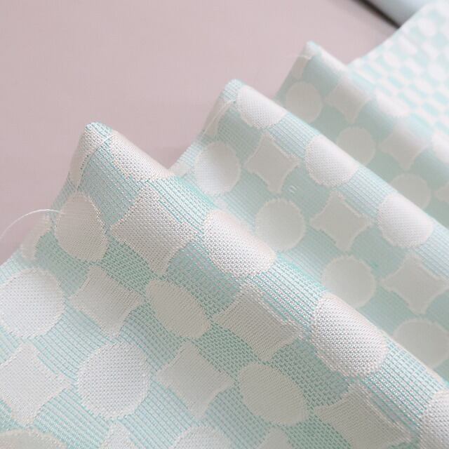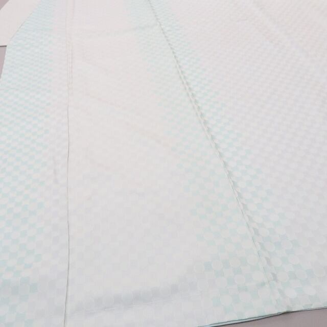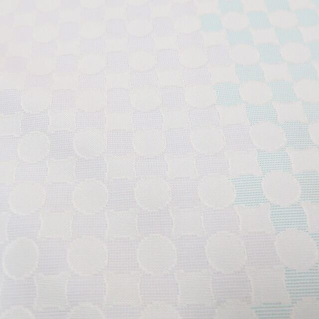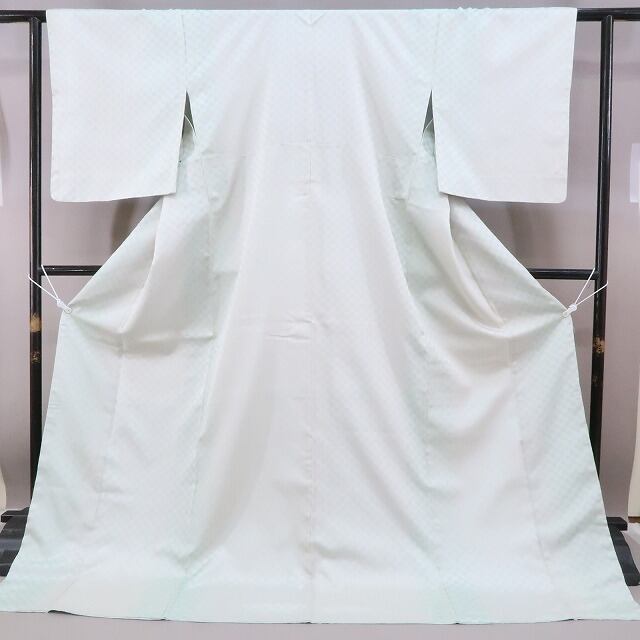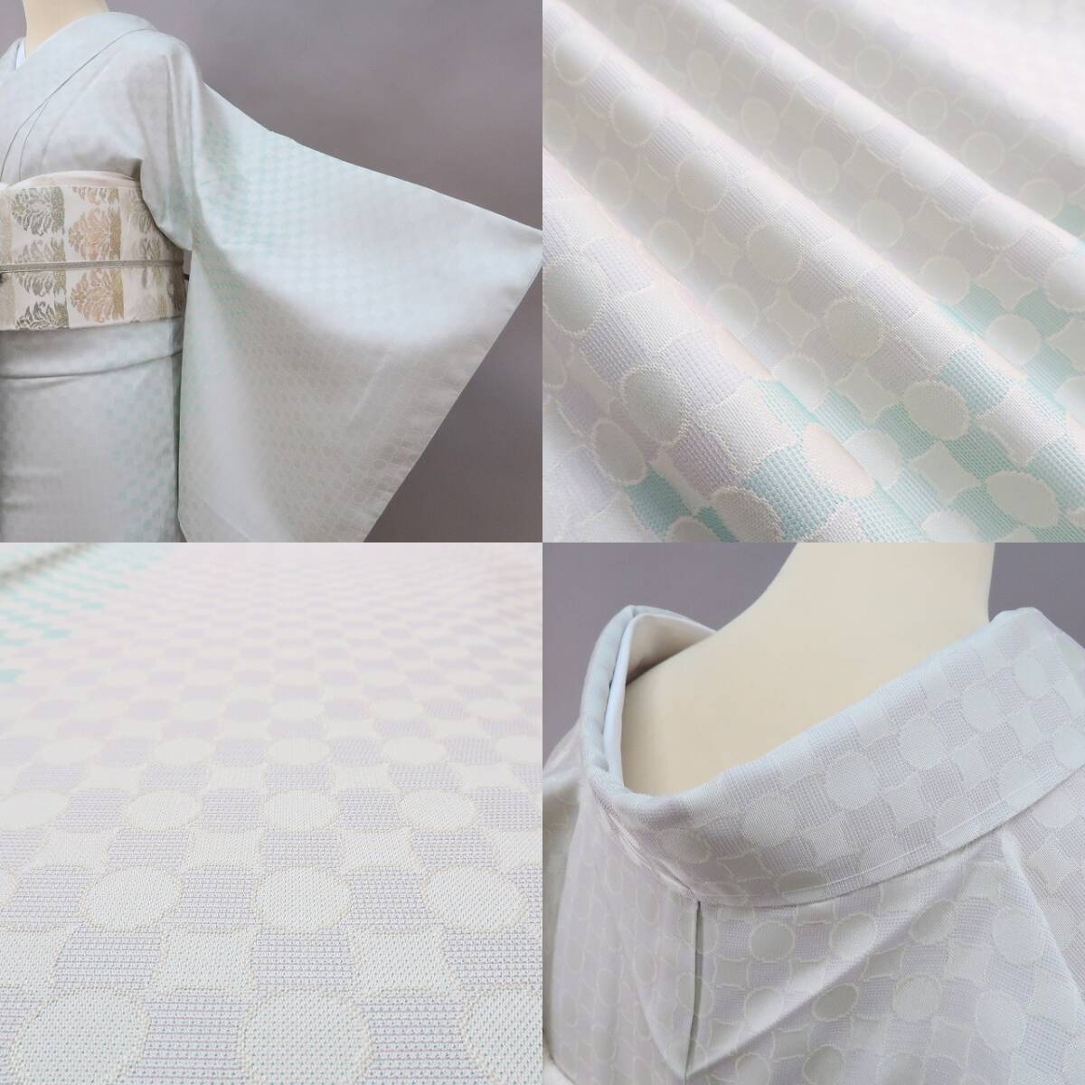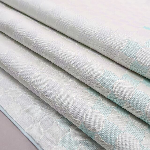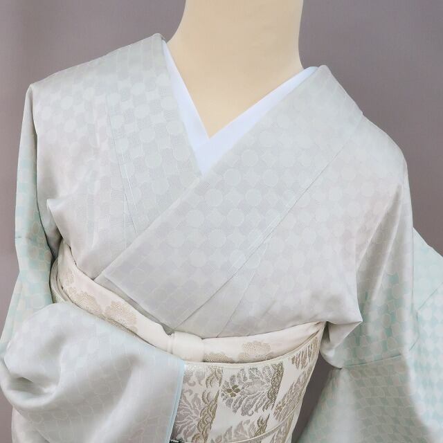 乳白色と白群色の優しいコントラストで全面を覆い尽くす繋ぎ小柄のデザインモチーフ、幾何学模様の連続柄が醸し出す何とも言えないお洒落感、シンプルながらダイレクトにセンスの良さを感じさせてくれるひと品…お召独特のしっとりとした風合いが着物の味わいを一段と馴染みやすい趣に変えています。