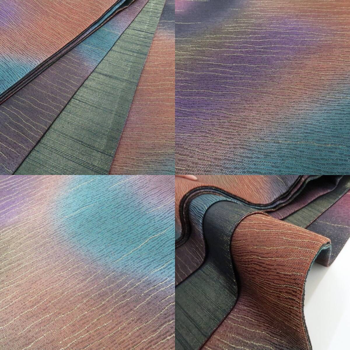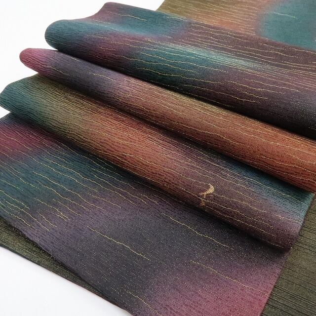 多彩な色味で柔らかな揺らぎを魅せるアブストラクトな暈しの濃淡、それは金通しの重厚感に独創の意匠が創り出す前田仁仙の世界観、正に“色の余韻に夢を見る”、何とも言えない独特の色合いが帯の深みを一段と美しく際立たせています。