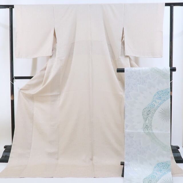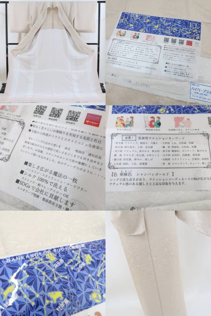 麻の葉の模様そのものに邪気をはらう力があるとされ江戸の女子たちの間で流行し、やがて麻は生命力がとても高く、まっすぐに育つことにあやかり、子どもの着物や下着、産着にも用いられるようになった“麻の葉”を星に見立てて亜麻色(シャンパンゴールド)でナチュラルに広げ、遠目には無地に見え、近づくとその満天の星空にふたご座やおとめ座、おうし座...と十二星座を配し、見る角度で変化し立体的に浮かび、視線を楽しませながら着姿もスラリとスタイリッシュに演出する、BANKAN“十二星座”洗えるシルク着物 色無地・袋帯2点セットでございます。