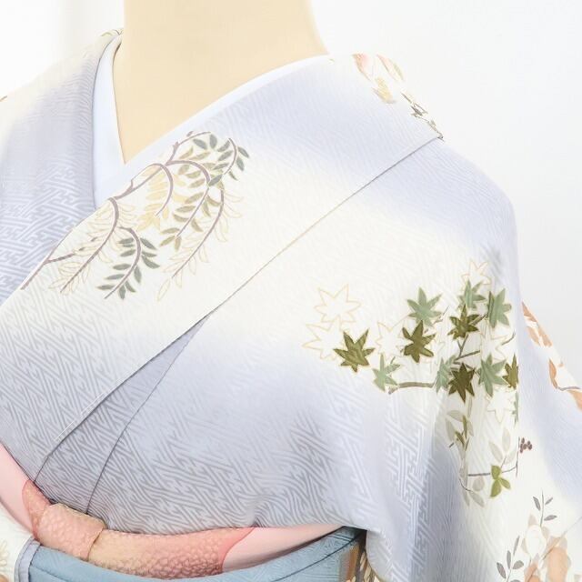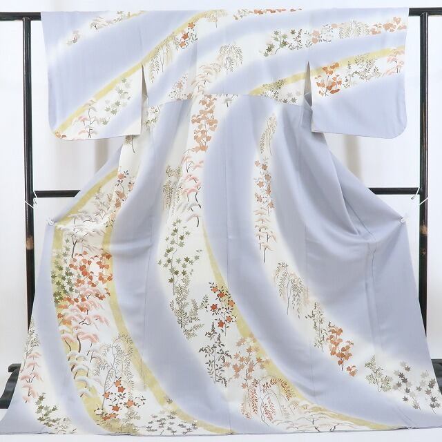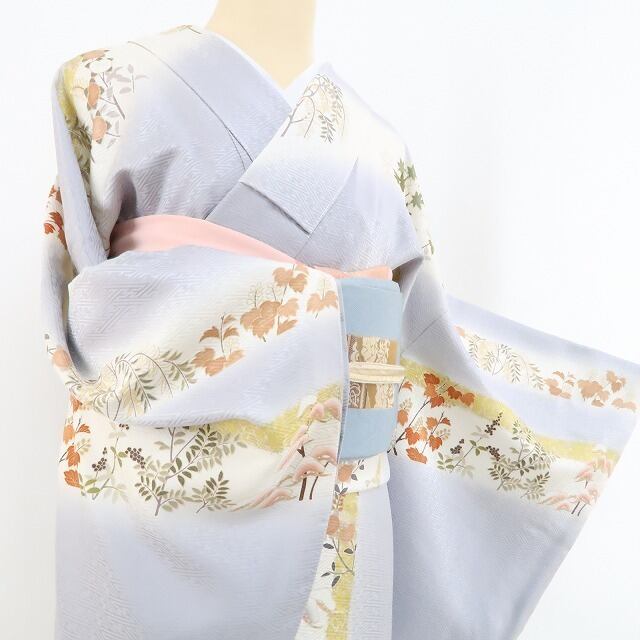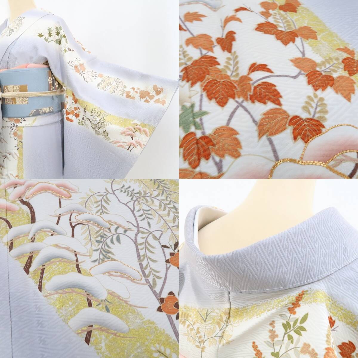 光沢ある藤鼠色の色地に多彩な色味で美しい表情を魅せる祝花や松の吉祥景色、巧みな構図に視覚のインパクトを残す金駒刺繍の煌き、シンプルなテーマながらも誰もが振り向く和の美しさ、それは正に“和香しき染めの華”、季節の装いに…美の極みに触れ至極の着心地があなたに充実したひと時を運んでくれることでしょう。