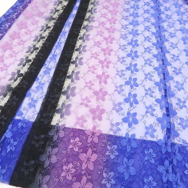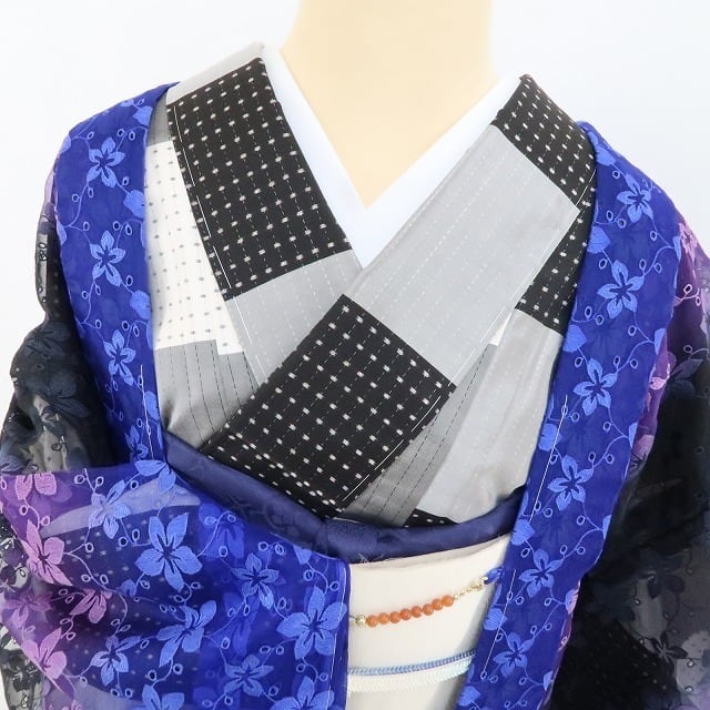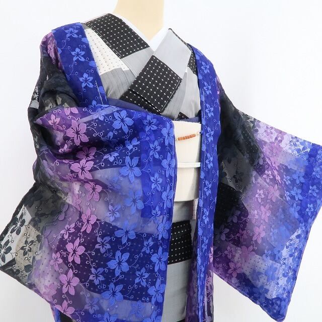 黒×瑠璃色×紫で上品な透け感に朧げな美しさを花開く春の虹は、目にも涼し気なその魅力に花笑みを繊細に繋いで次々と舞い込む幸せを逃すことなくぐっと掴み、これから重なるお着物と分かちながら始まりを迎えた春を素敵に演出する、オーガンジー“暈し”ロング丈仕付け糸付正絹長羽織でございます。