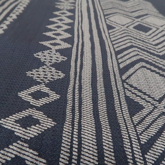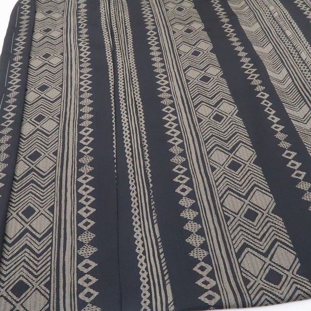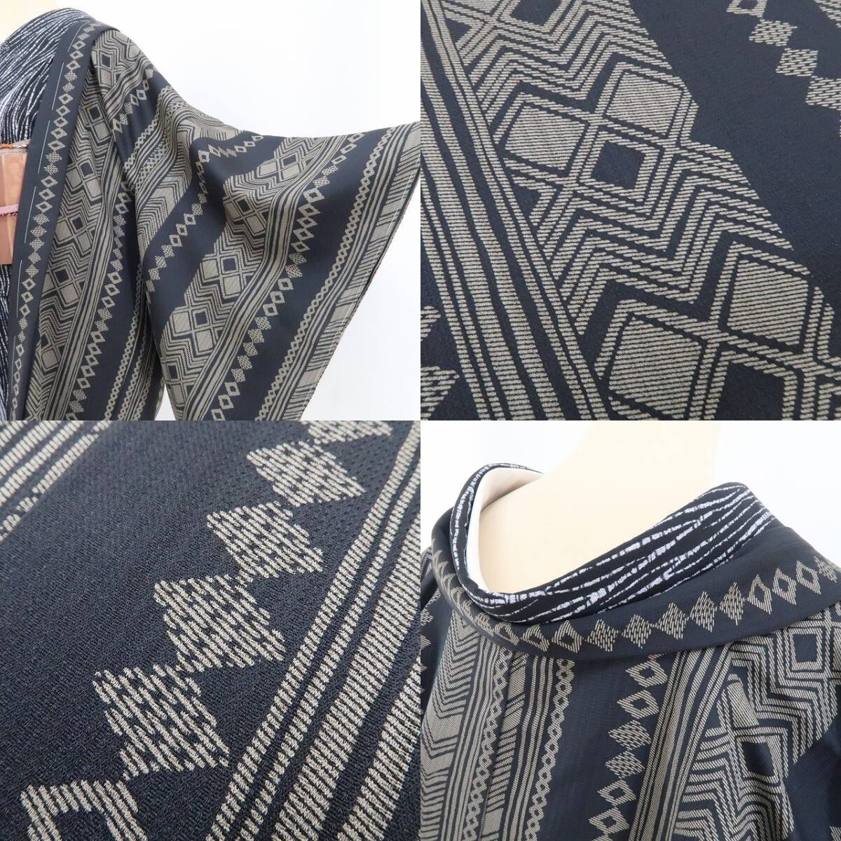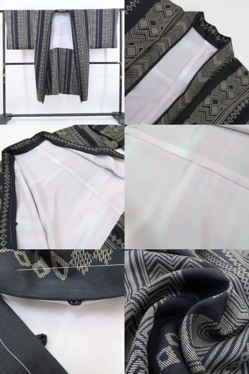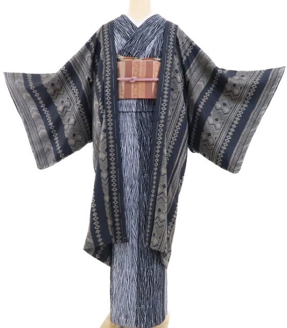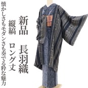 大切なお着物をお守りしながらカーディガン感覚で寄り添う長羽織、今、ワードローブで待つお着物たちに合わせて何枚か揃えて置きたいもの。シックな色使いでお色合わせもしやすく、時には主役にもなるこちらの一枚は、縞やひし形、山路を操り、遠目には矢羽や絞り柄、見る角度で立体的にも見える独特の柄を連ね、懐かしさと共にどこかモダンな風を吹かせる粋な魅力を披露...。