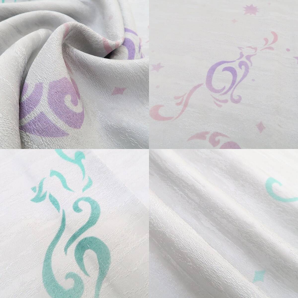 繊細な表情を見せながらしっとりと広がるグレーの花曇りの空を見上げると、ぱっとロマンティックな明かりを灯す三日月や星、その三日月や星を追いかけてついには空をも翔ける猫が現われ、これから目の前をロマンティックで満開に彩る、単衣“猫”正絹 仕付け糸付小紋です。