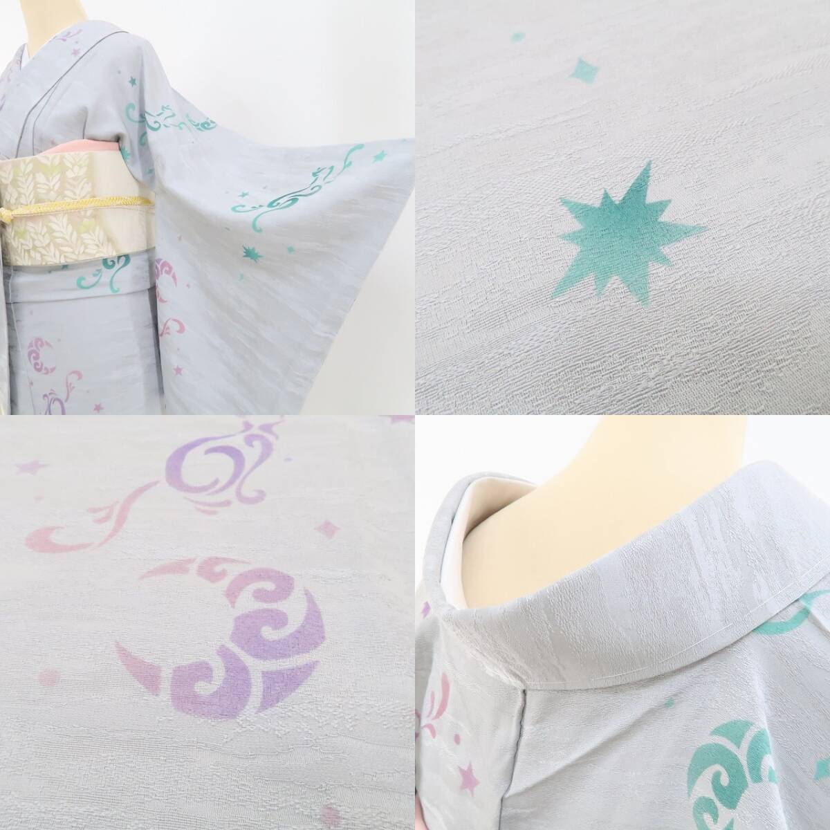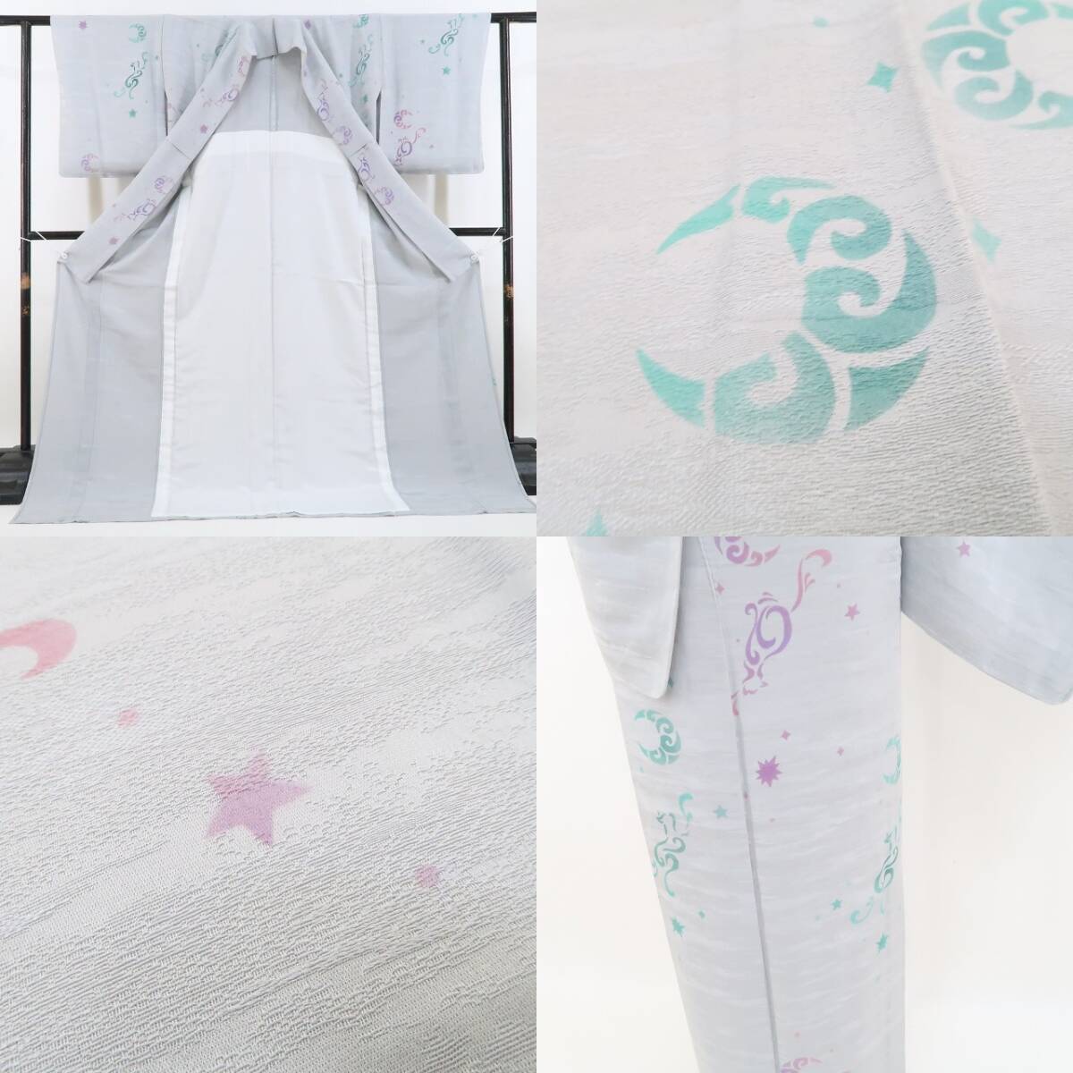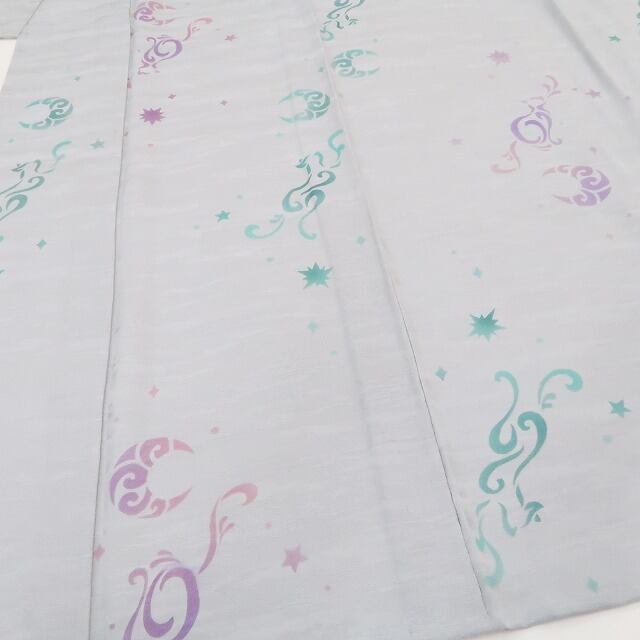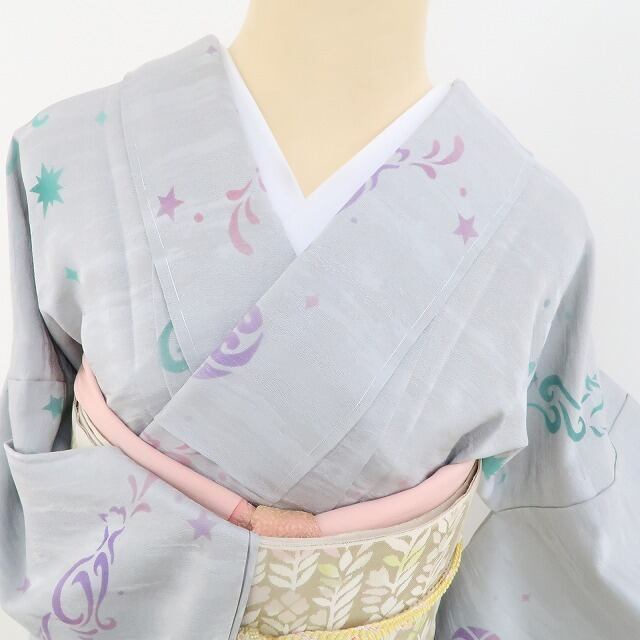新品 単衣 猫 着物 正絹 仕付け糸付“三日月と星と猫のロマンティックな明かりが灯る花曇りから満開へ”小紋 3291