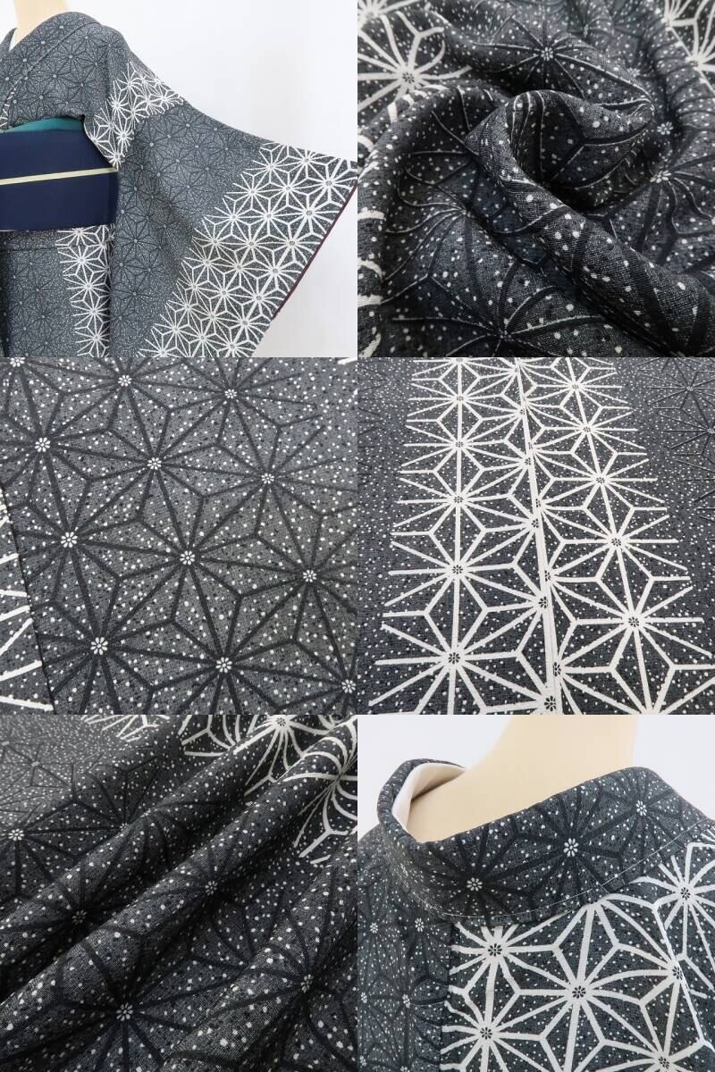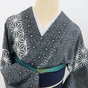 落ち着きあるグレーの色地を帯状に走る縦縞の濃淡、彩りに鮮烈なインパクトを残す麻の葉繋ぎの色模様、馴染みの定番柄が醸し出すえも言われぬ心地よさ、それは巧みな構図に映し込まれた今をときめくモダンな色艶、正に“いつの世も視線を射止める小紋の王道”、素敵です。