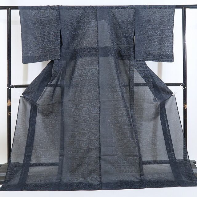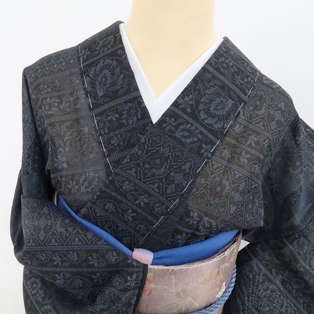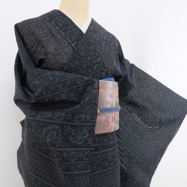 懐かしさを物語る藍鉄色が見せる透けるように薄い夏顔、そして層のように広がる唐花やダイヤ形、ぎざぎざとリズムをつけてそこはかと異国情緒を漂わせて築き上げた美は、見て、着て心地よい涼で満ち、シックに華を咲かせる夏の楽しみとなる、紗紬“カタス式”7マルキ夏着物仕付け糸付正絹本場大島紬でございます。