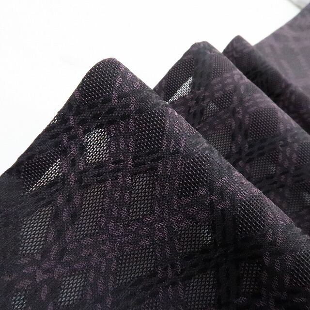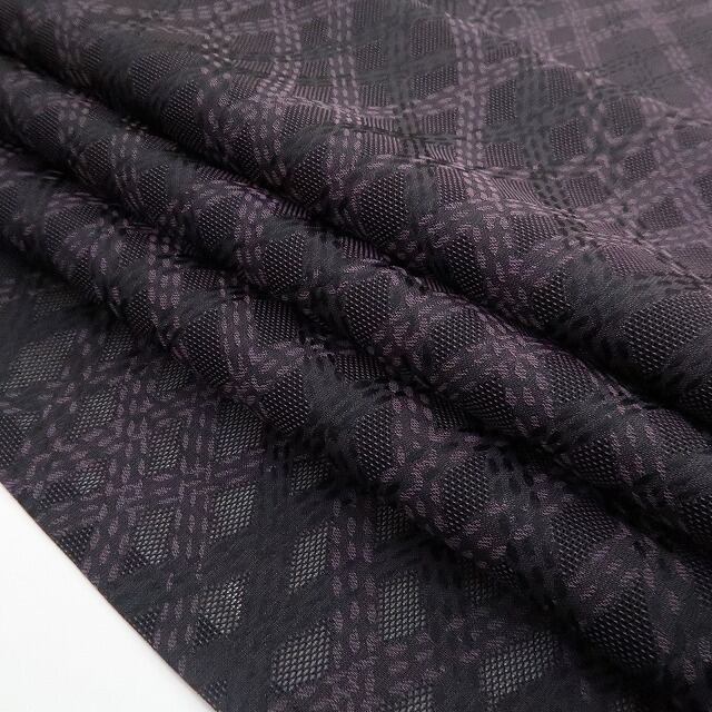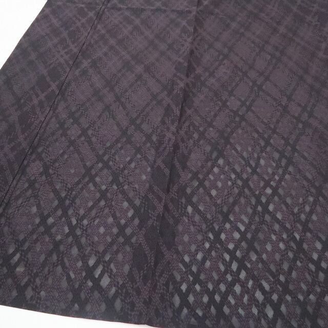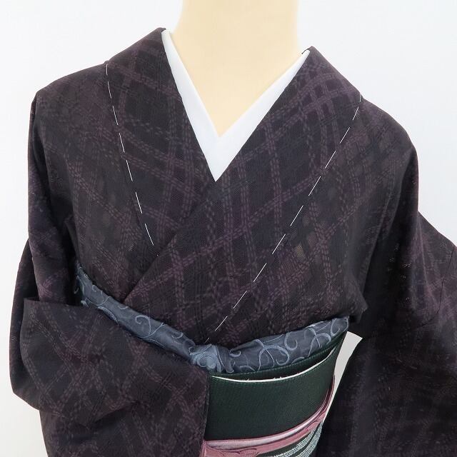 落ち着いた葡萄色の地に浮かび上がる斜め格子の流線模様、お召地に不統一なデザインラインが醸し出すモダンな風…手くくり手摺り込みによる絣糸を一本一本合わせながら織り上げるお召の味わい、独特のしっとりとした風合いが着物の味わいを一段と馴染みやすい趣に変えています。