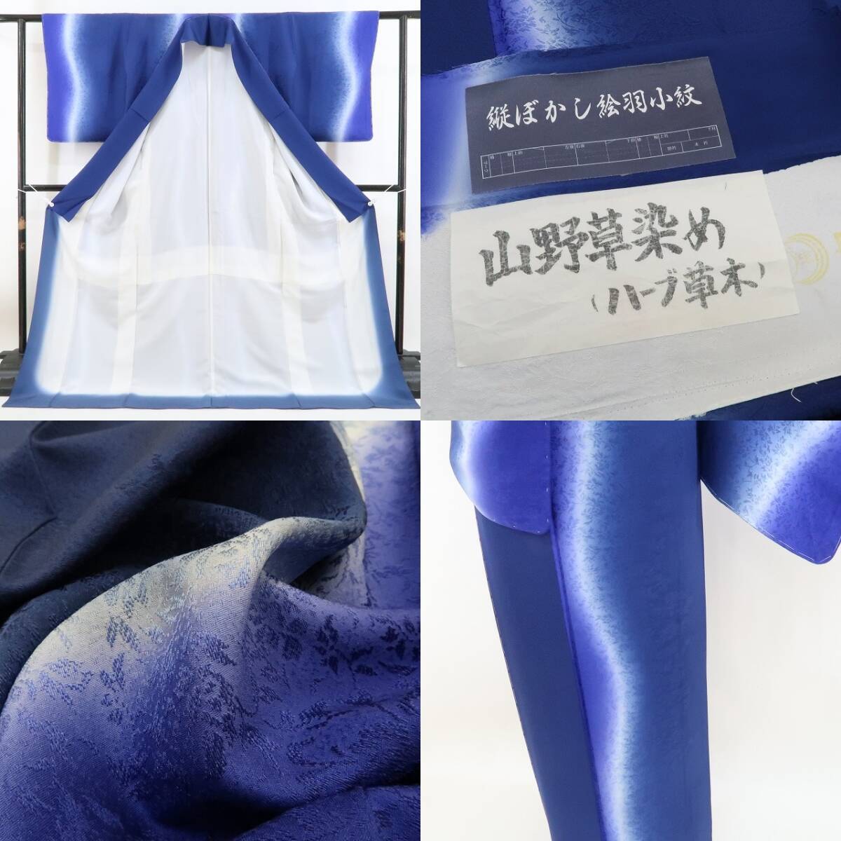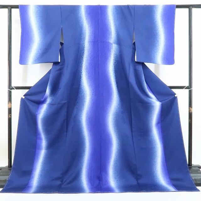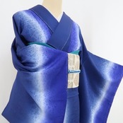 静かに静かに美を置く留紺色×鉄紺色にぴかっと翔けて轟く雷鳴のように波打ちながら翔ける淡い光、そのやわらかな雰囲気をつくる神秘的な美しさを追いかけると、味のある息吹を浮き立てるまさかの出会いを果たして自然と女性らしさがぐっと引き立つ和姿を手にする、縦暈し“山野草染め”正絹仕付け糸付小紋でございます。