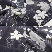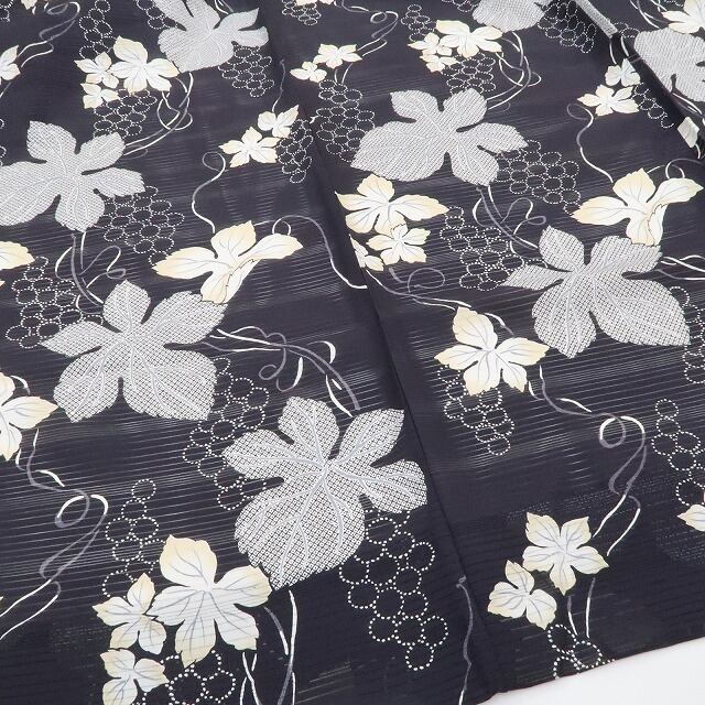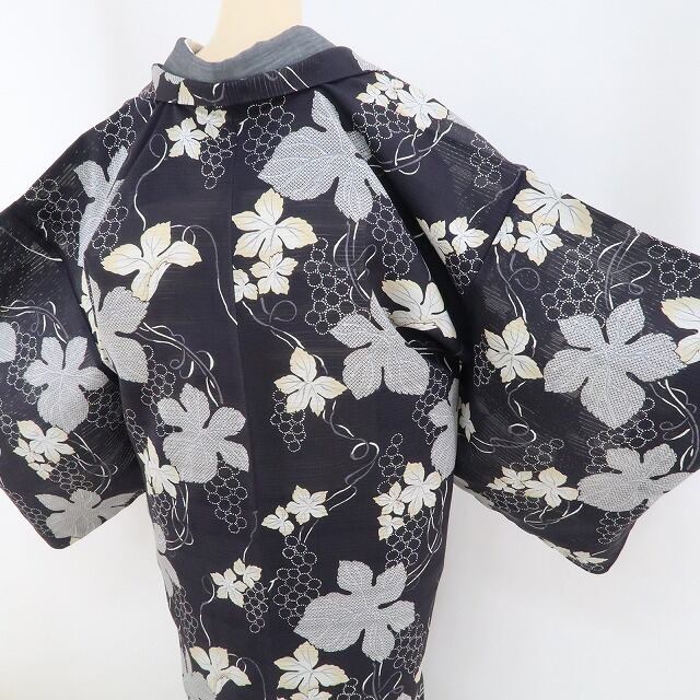 しなやかな蔓に大きな葉を揺らし、小さく可愛らしい姿を点々と現して深紫色の涼やかな風に乗り、芳醇な薫りで心を酔わせる葡萄が実り、下に重なるお着物を透かせながら夏の雰囲気を盛り上げ、そっと次の季節の足音を響かせる、変則絽“葡萄”夏着物 紐付き ロング丈 仕付け糸付長羽織でございます。