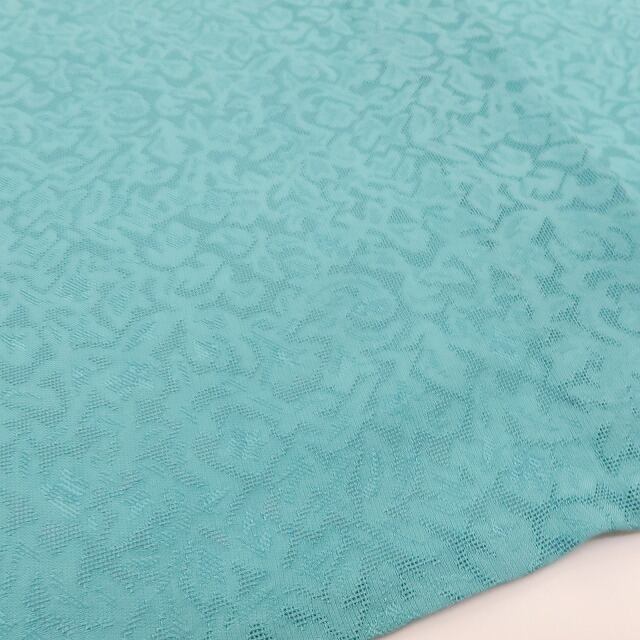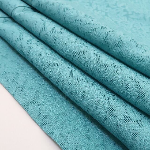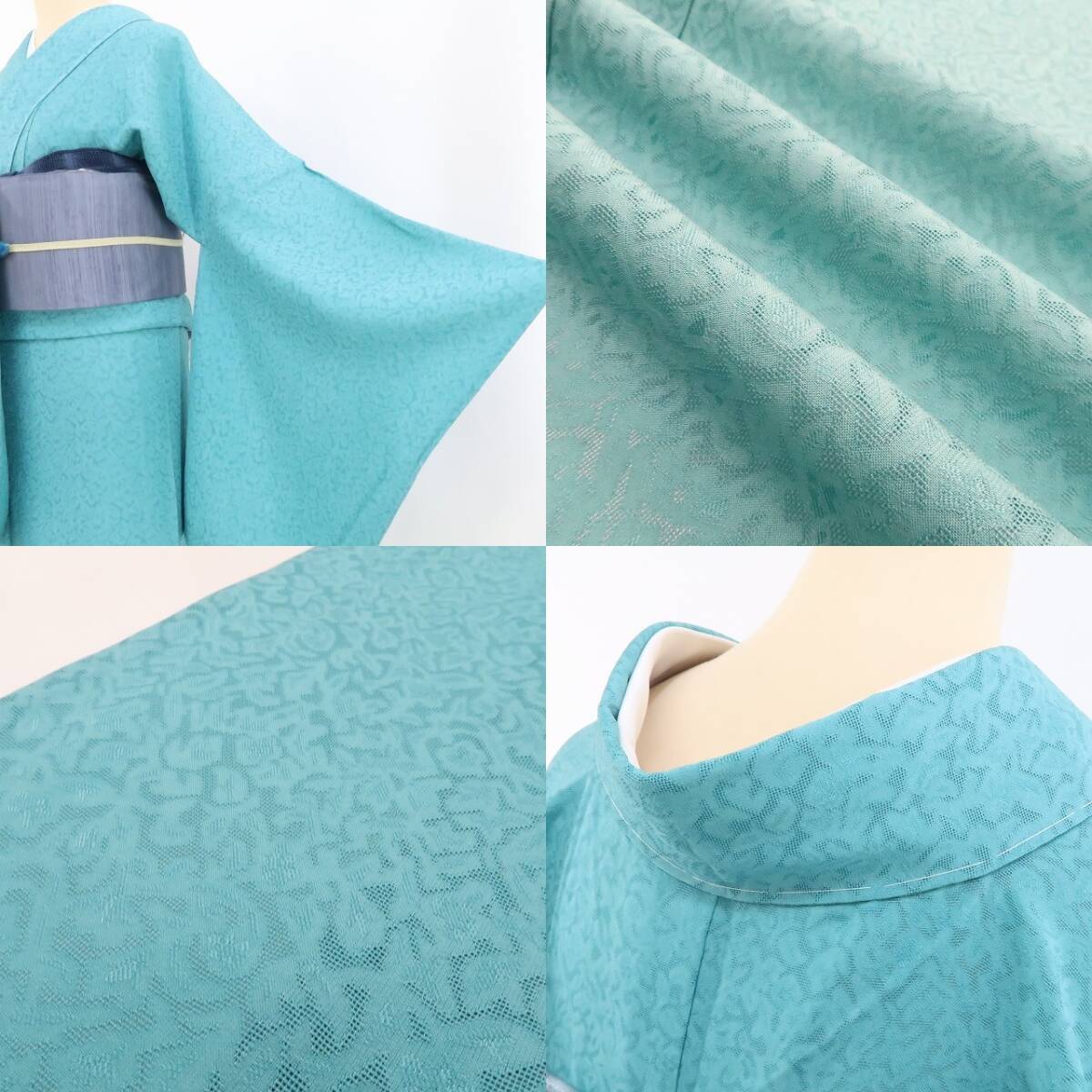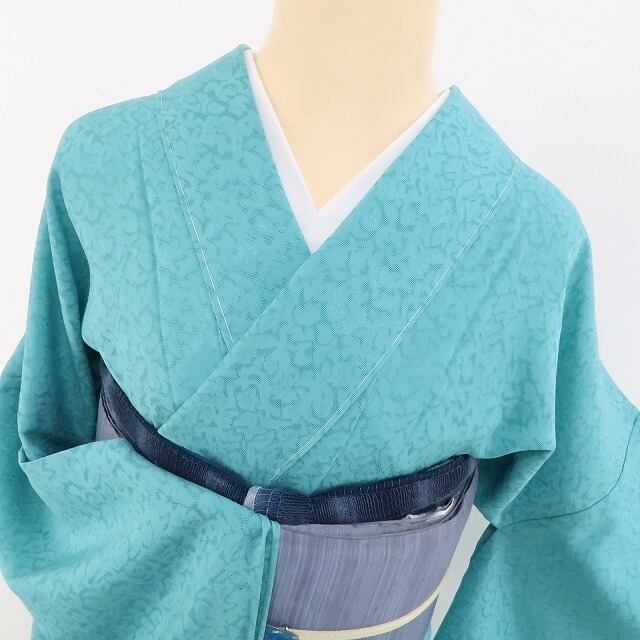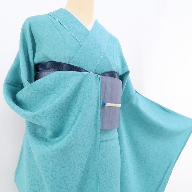 大人びた青緑色の地にどこか艶めいた風を醸し出す創作花柄のデザインモチーフ、紋紗の透明感に花の煌きが添えるこの上ないお洒落感、それはモダンお召の粋な奥行…手くくり手摺り込みによる絣糸を一本一本合わせながら織り上げるお召の味わい、独特のしっとりとした風合いが着物の味わいを一段と馴染みやすい趣に変えています。