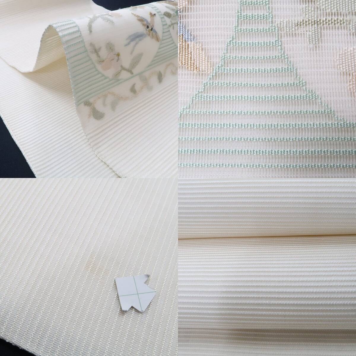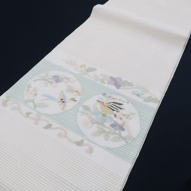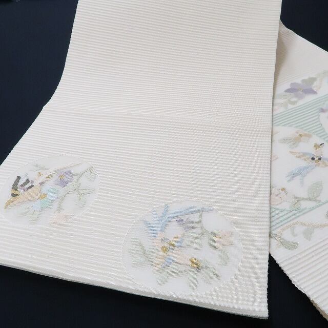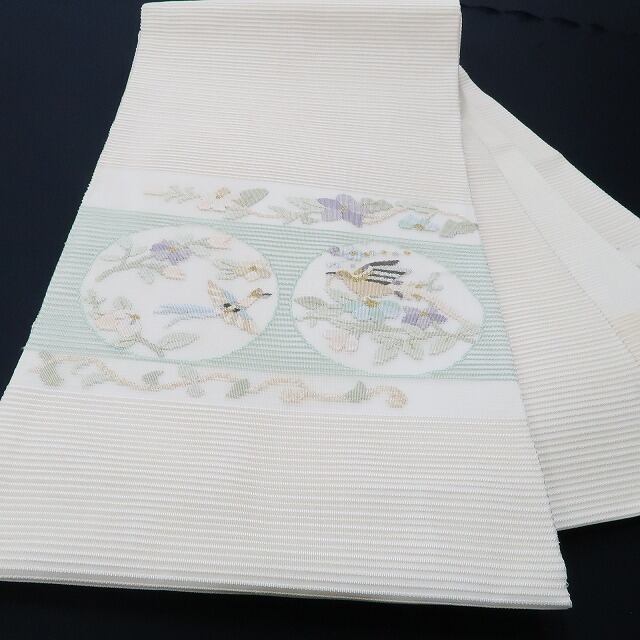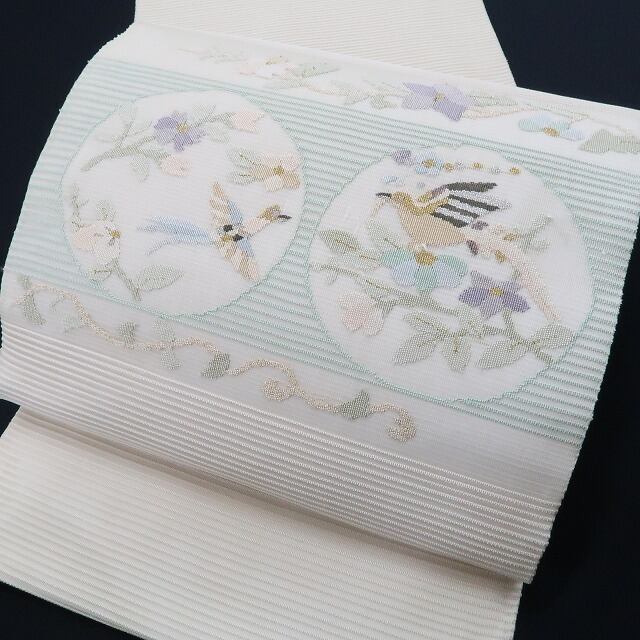 爽やかな象牙色の地を横段状に走る麗を湛える花デザイン、丸みのフォルムに花喰い鳥が添える和を心得た洒落ごころ、それは絽綴れに聞こえてくるシンプルモダンな涼の風音、楚々とした趣に潤いある夏の煌きがとても印象的なひと品、お気に入りの着物と合わせて、さぁ素敵な夏の女性を表現してみましょう。