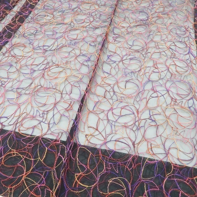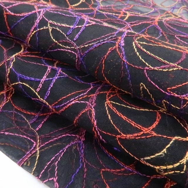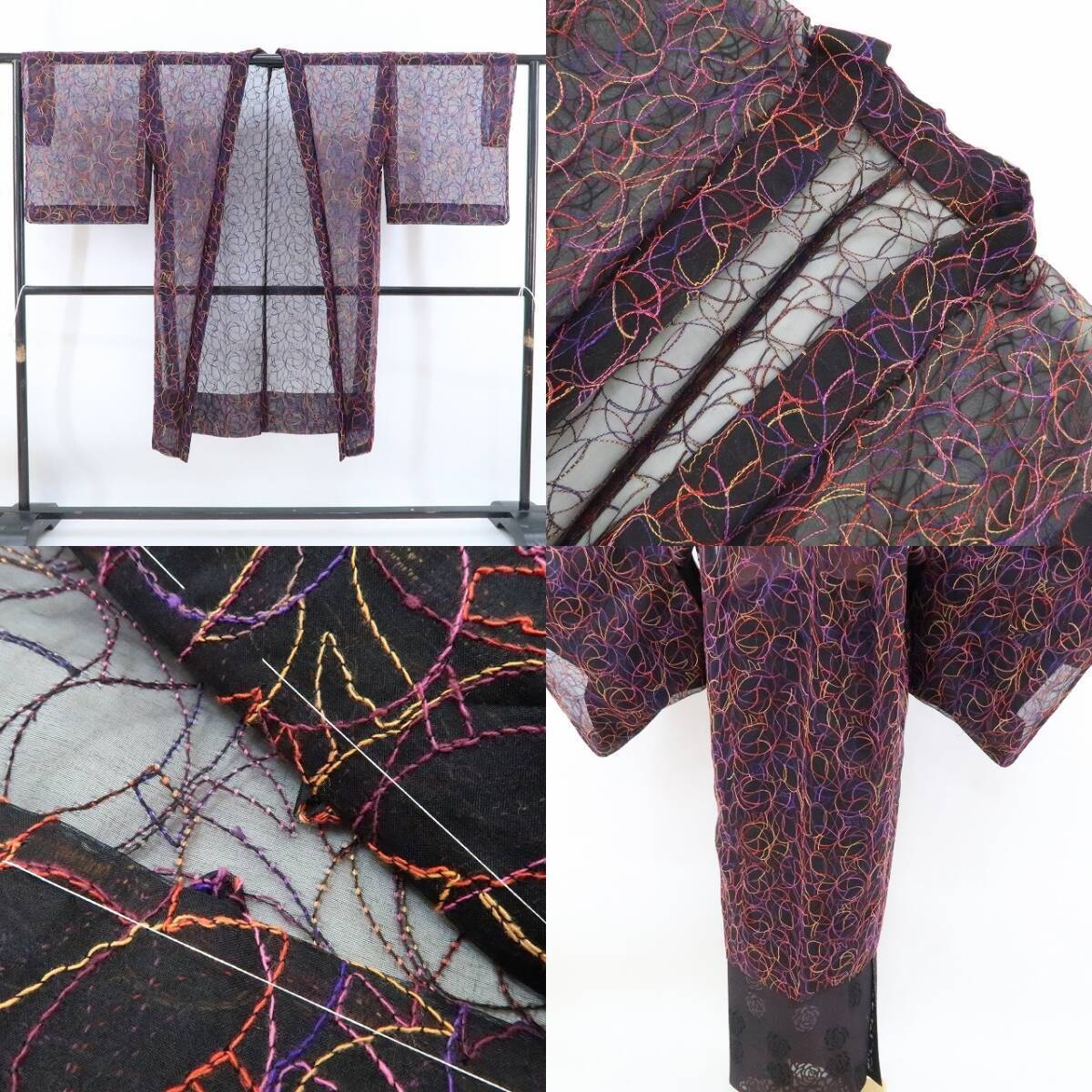 シックな黒を基調に多彩な色味で弧を描く流線状のデザインライン、巧みな意匠が創り出すえも言われぬお洒落感は必見!それは正に創作着物の奥行そのもの、涼やかな表情に込められたお洒落モダンな和の香り、お奨めです。