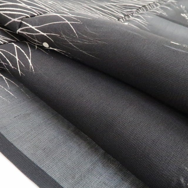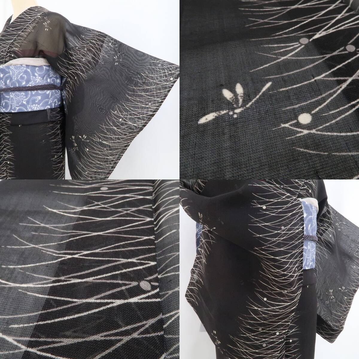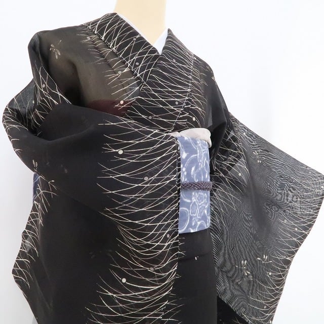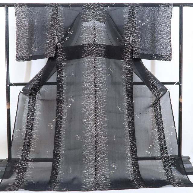 素材感が活きる黒の色地に縦状の構図で連なるデザイン露草の波模様、紗紬の透明感に季節を奏でるトンボの風情、それは“誰にでもある心の風景”…溢れ出す涼やかな表情は夏着物の魅力そのもの、これぞ!お洒落な貴女のお気に入りになること間違いなし。
