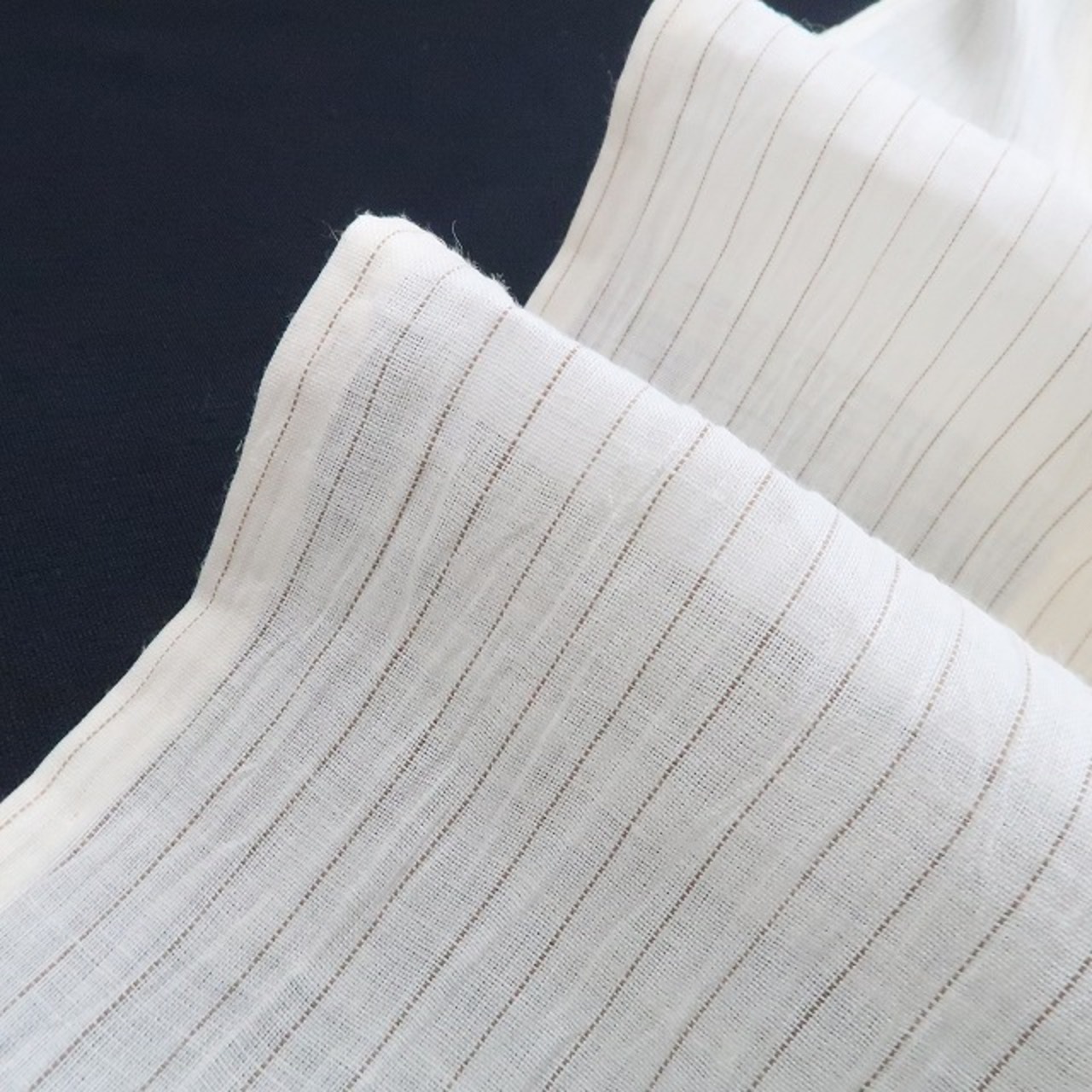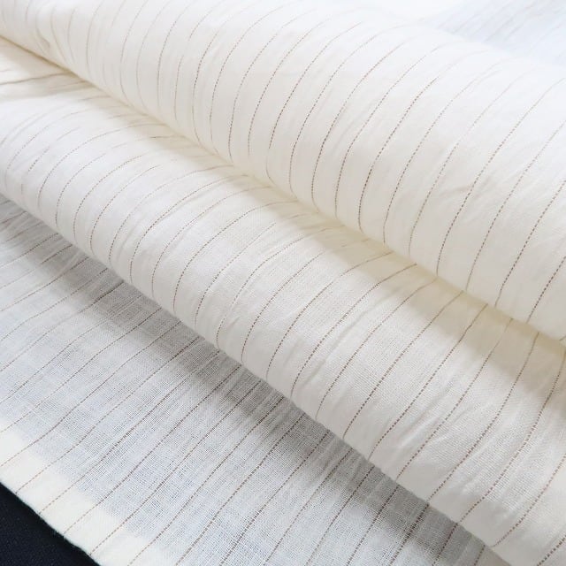 爽やかな象牙色の地を抜ける心地よい風、さりげない表情で引かれた馴染みの縦縞模様、シンプルながら受け継がれる伝統技が創り出すこの上ない夏の涼味、それは正に“想いを繋ぐ織りの真心”…本場縮に広がる自然味豊かな麻の素材感が貴女に快適な着心地をお届けします。