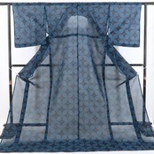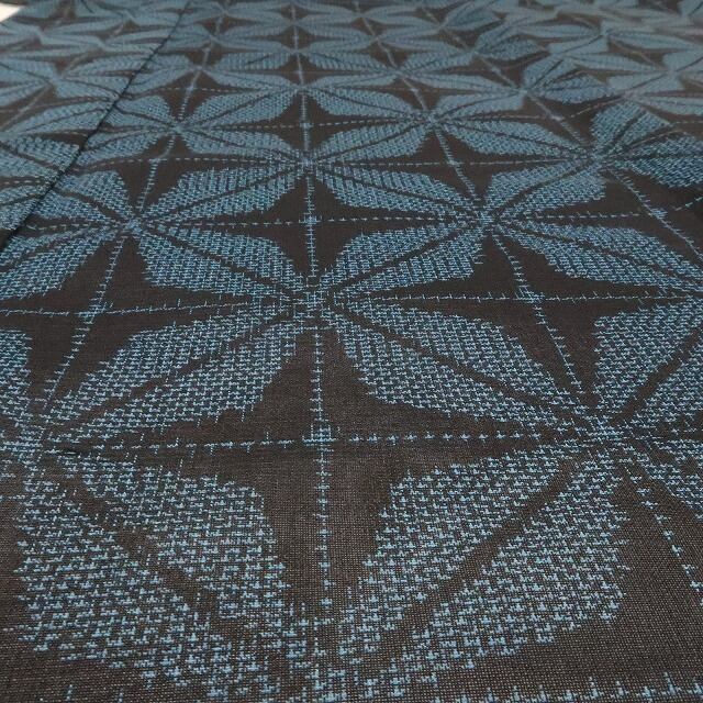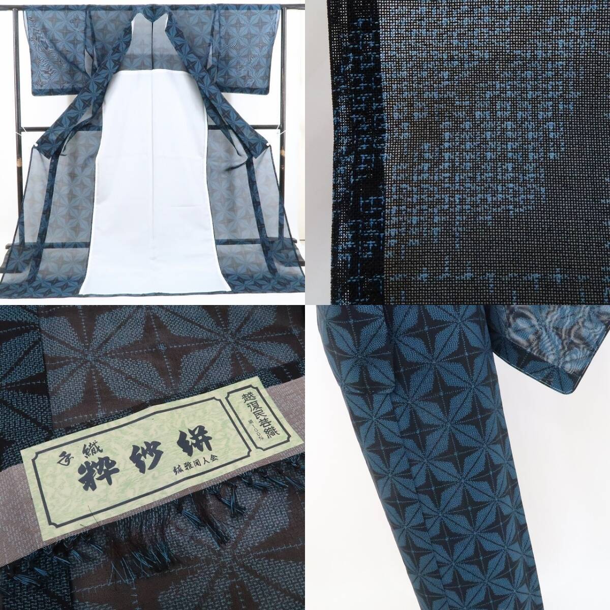 夏ならではの透け感を連れてハンサムな顔を見せ、まるで水面のように涼し気な黒×納戸色には、ロマンあふれる星、手裏剣や風車を思わせる十字型を宿す七宝が整然と連なり、見る角度を変えればゆらゆらと花菱となり、また違う表情が立体的に浮かび上がり、巧みな変化を見せながら涼やかに心地よくもてなす、“紗紬”経緯絣 カタス式 夏着物 正絹 お仕立て上がり品 仕付け糸付 トールサイズ大島紬でございます。