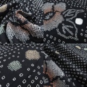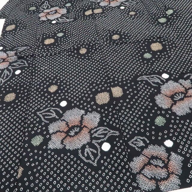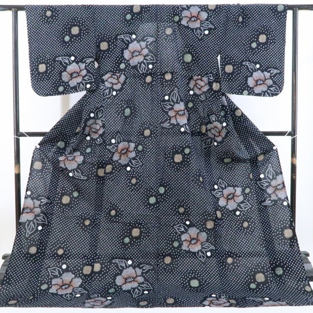 静寂を打つ黒にどこか幻想的に浮かび上がり、可愛らしい笑顔を振り撒く花、小さな惑星の如く漂う朧げな球体は、どこまでもどこまでも広がる印象的に静寂を彩り、肌にふわり優しく沿い、涼しく蒸れない心地よさ、気になる体型カバーもこなし、袖を通す貴女を可愛らしさを咲かせながら贅沢な存在感を漂わせる夏姿へと誘う、“有松鳴海絞り”夏着物高級浴衣でございます。