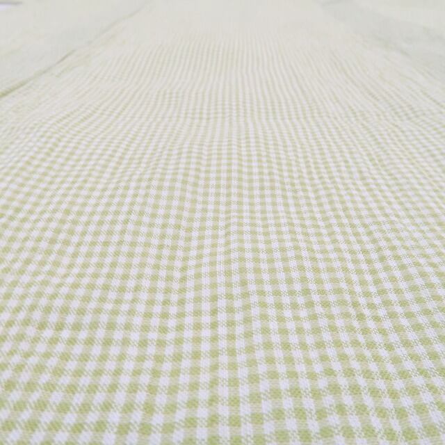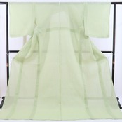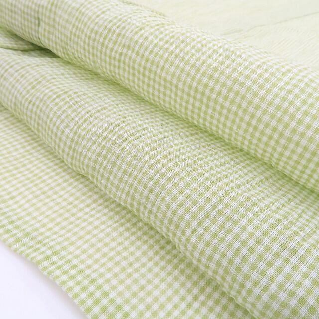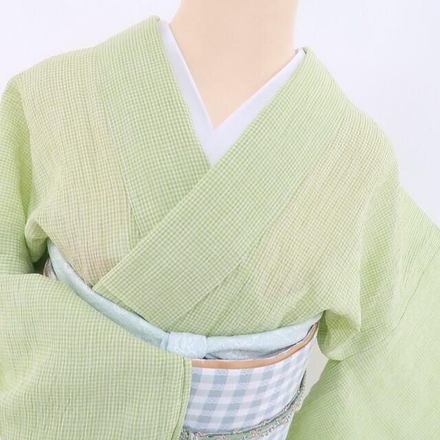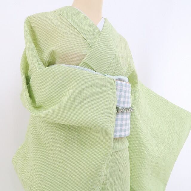 若苗色の色地で引かれたお洒落格子のチェック柄、キラキラとした煌めきに伝統技が注ぎ込むこの上ない夏の涼味、それは貴女に届く“いつもの夏の贈り物”…モダンなタッチで描き込まれた格子の濃淡が着物に風を吹き込むかのような趣で美しい表情を奏でています。