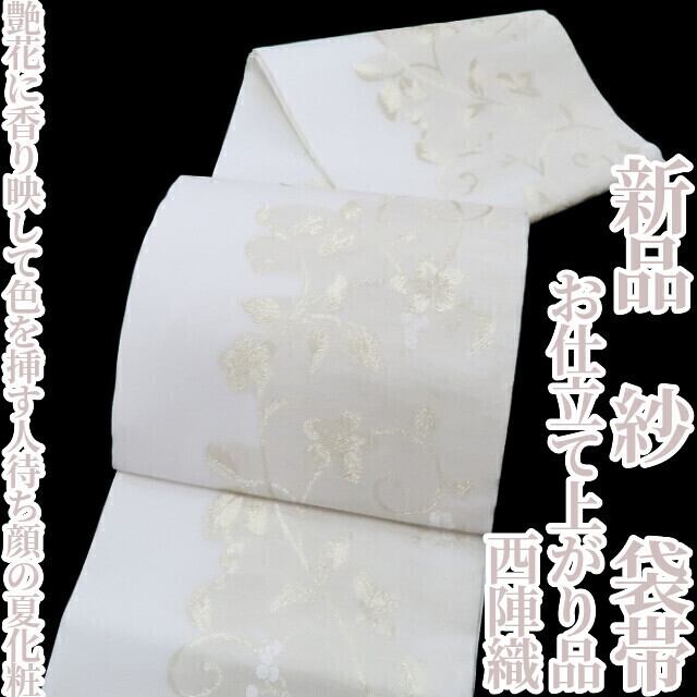 新品 紗 お仕立て上がり品 夏着物“艶花に香り映して色を挿す人待ち顔の夏化粧”正絹 西陣織 袋帯 3679