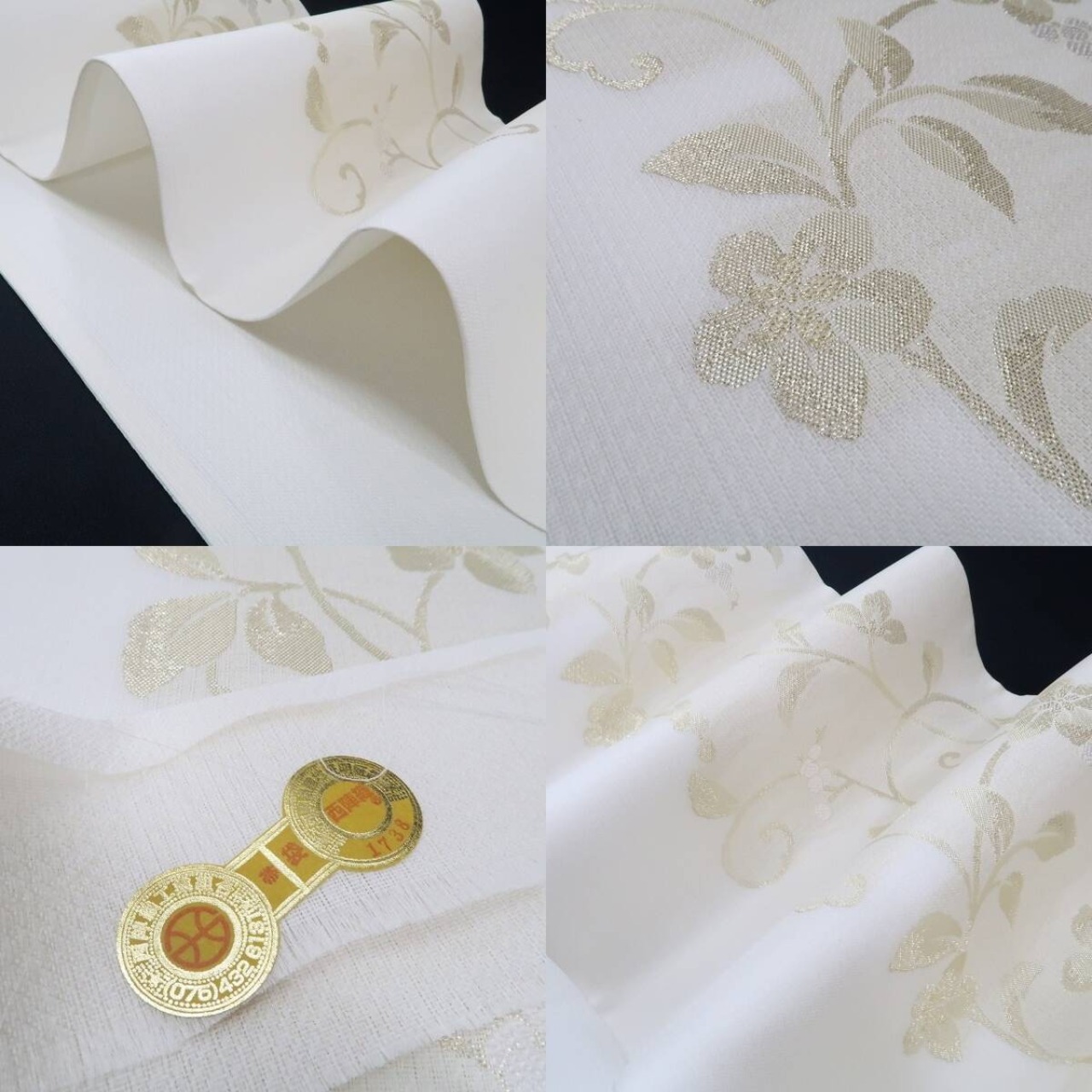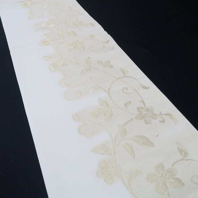 楚々とした白の色地にゴールドの色糸で織り込まれた可憐な夏花、紗の透明感に照らし出された落ち着き払う大人色の表情、それは守り継がれる西陣の伝統が創り出す高級帯の世界観、素敵です。