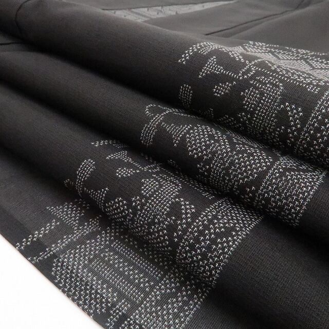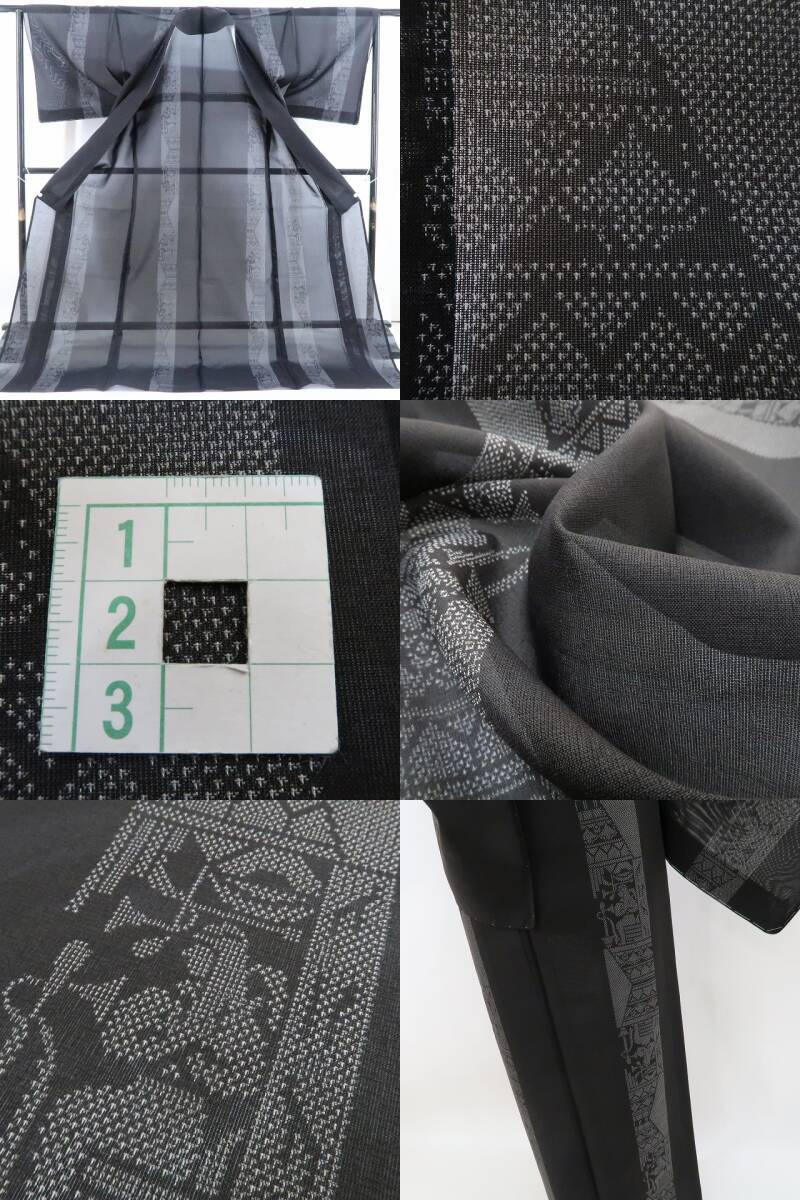 黒の色地に縦縞の構図で描き込まれた洗練モダンなデザインライン、それは巧みな意匠に込められた遥かを望む大陸の風、紗の透明感に大島独特のシャリ感が醸し出すこの上ない夏の涼味は格別!素敵です。