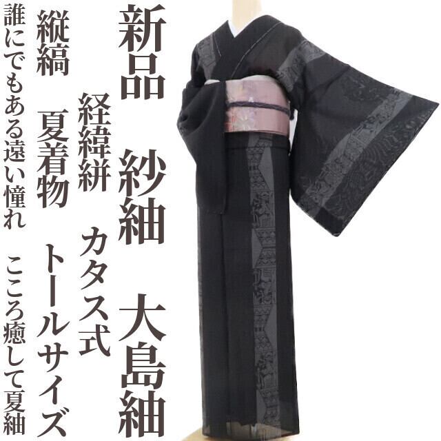 新品 紗紬 夏着物 経緯絣 カタス式 縦縞“誰にでもある遠い憧れ…こころ癒して夏紬”仕付け糸付 トールサイズ 大島紬 3721