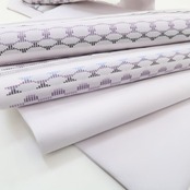 沖縄の紋織の一種「花織」。沖縄本島の読谷・首里、与那国島や奄美大島などで生産され、経糸と緯糸を1本ずつ交互に織り合わせる代表的な「平織」に対し、2本・3本と糸を飛ばして変化を加えたり、文様の部分の糸を浮かせて柄を表現。経糸が緯糸を浮かせて織り表す「小さな四角の点」で表現される様々な模様は可憐な花のように美しく、素朴ながらも立体感があり、それぞれの産地で異なる特徴があります。