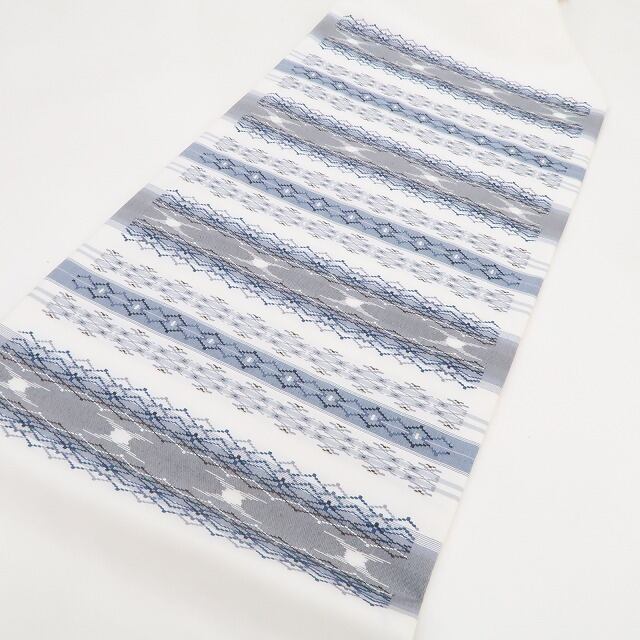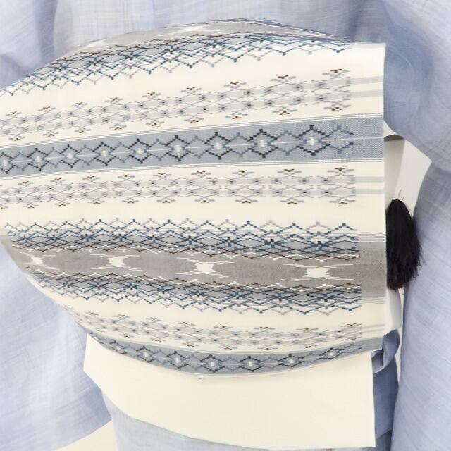 清らかな心に菱形や四角ぎざぎざや縞を組み合わせた独特の美しさが立体的に浮かび上がり、大人の雰囲気を漂わせながらその個性をアピールしてカジュアルなひと時からセミフォーマルなお席に寄り添い、いつもと違う華を咲かせる、“南風原花織”夏着物正絹証紙付なごや帯でございます。
