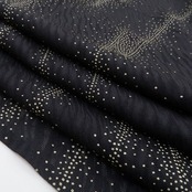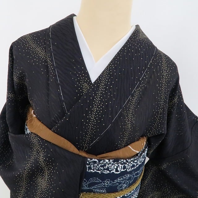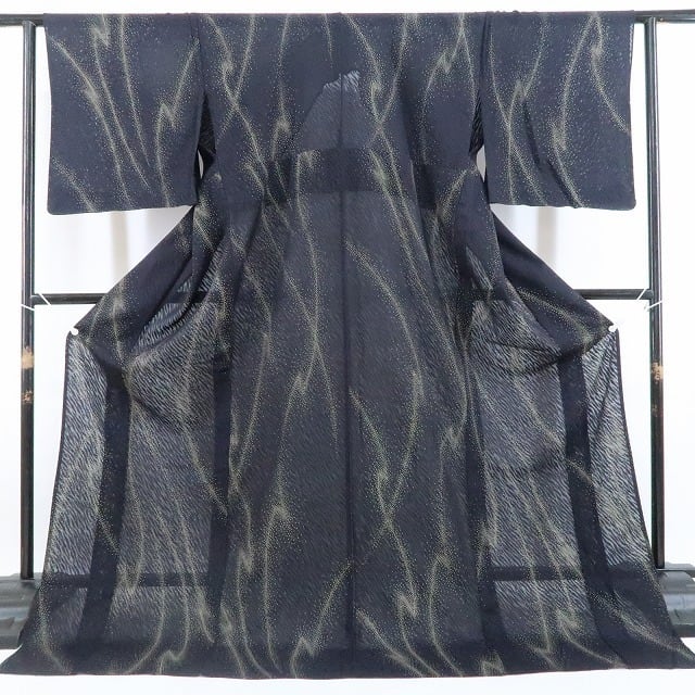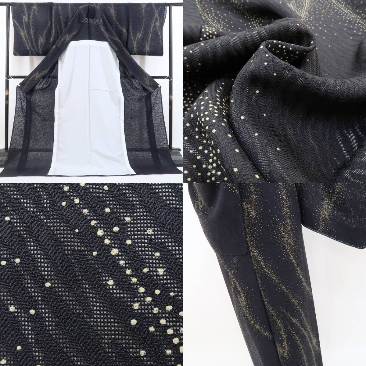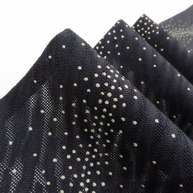 黒が開く夜のしじまを幻想的に彩る何か。あの海の宝石ともいわれる夜光虫を想像させるその姿を追いかければ、目にも美しく涼し気な透け感に躍動を浮かべるしじまと共に独特の味で浮き立つ細やかな細やかな水玉を飛沫のように操り、目にする者に幻想的な癒しを運び、視線と心を鷲掴む、紋紗“印伝”夏着物正絹仕付け糸付小紋でございます。