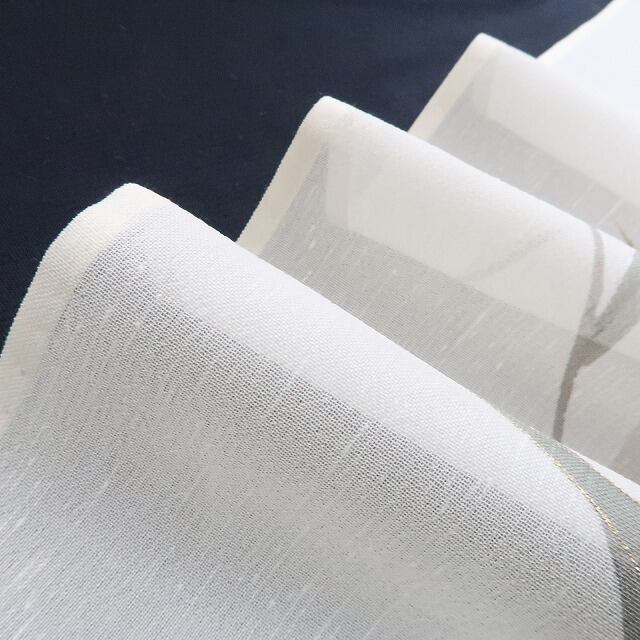 二本の経糸で緯糸一本ずつをからめて織り上げたシンプルなもじり織で、絽以上に透け感がある“紗”。織り柄のある紋紗、こちらのように紬糸を使った紗紬などがあります。7月、8月の盛夏はもちろん、白襦袢ではなく色襦袢を重ねて透け感をなくして悪戯な気温の変化を見せる6月、9月の単衣の季節にも着られます。