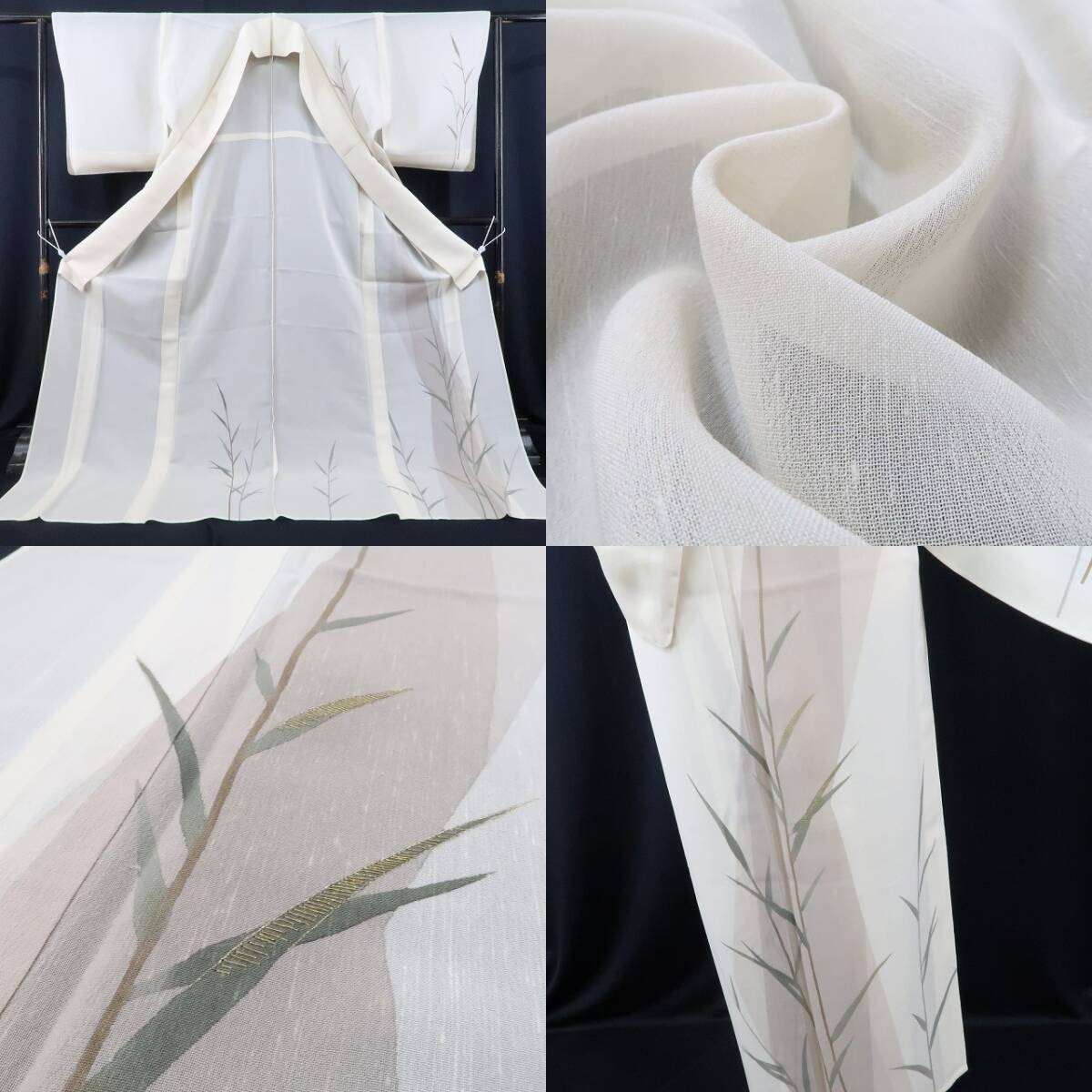 親しみのある素朴さに目にも美しい透け感を連れて穏やかに広がる夏、その美しさに惹かれてそっと揺らめき、そっとおめかしして心地よい騒めきを響かせる笹を清くとらえた、“紗紬”夏着物正絹トールサイズ仕付け糸付訪問着でございます。