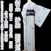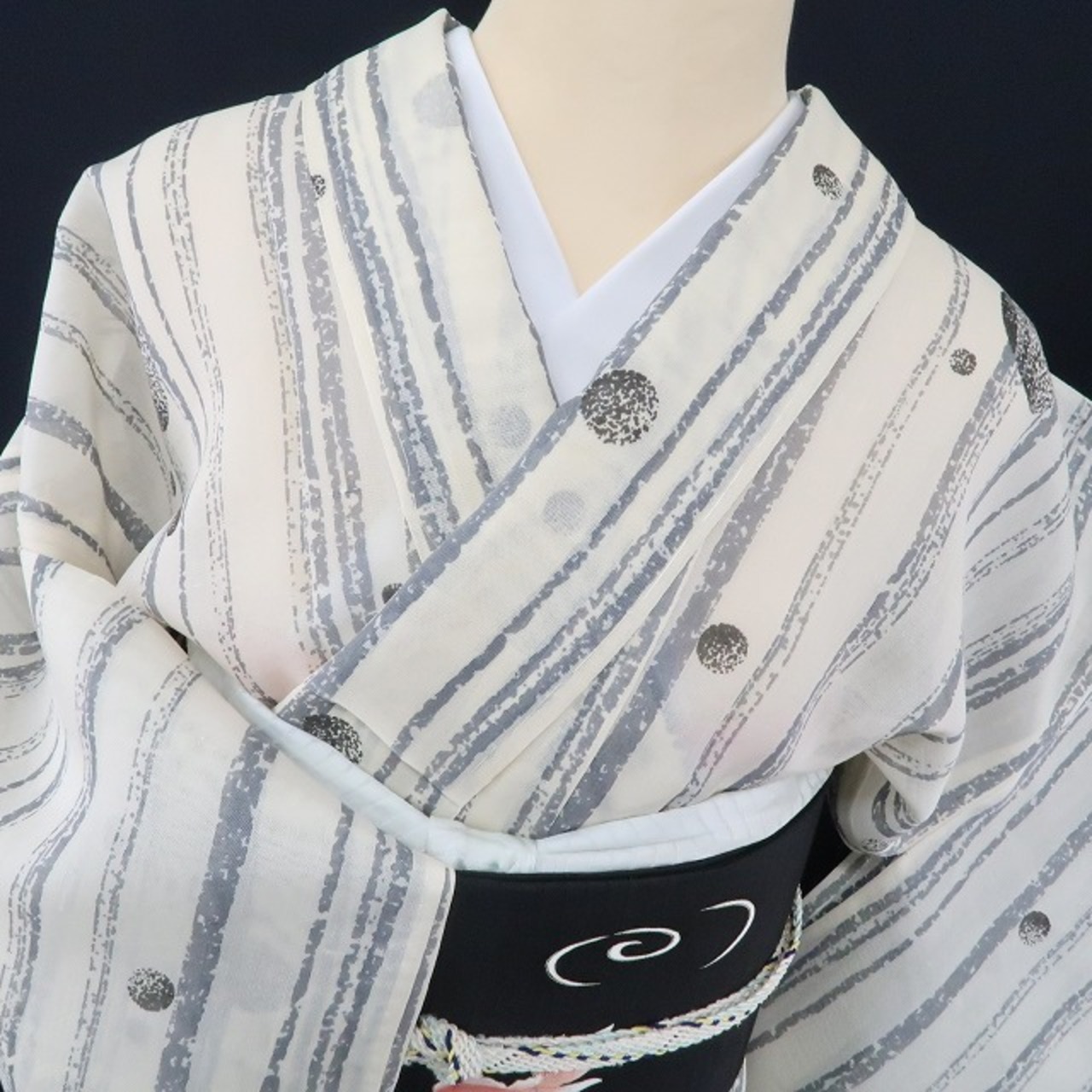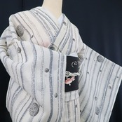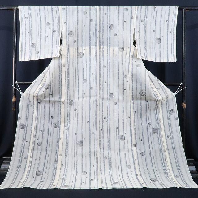 親しみのある素朴さと目にも美しい透け感で、ぐっと視線と心を惹きつける粋な引力を解き、大小の幻想的な惑星を一気に昇華させる夏を開花、袖を通せばいつまでいつまでもここにいたい...と思わせる最上の心地よさでもてなす、“紗紬”伝統工芸士「白川貞夫」落款 水玉×縦縞 夏着物正絹仕付け糸付絹芭蕉でございます。