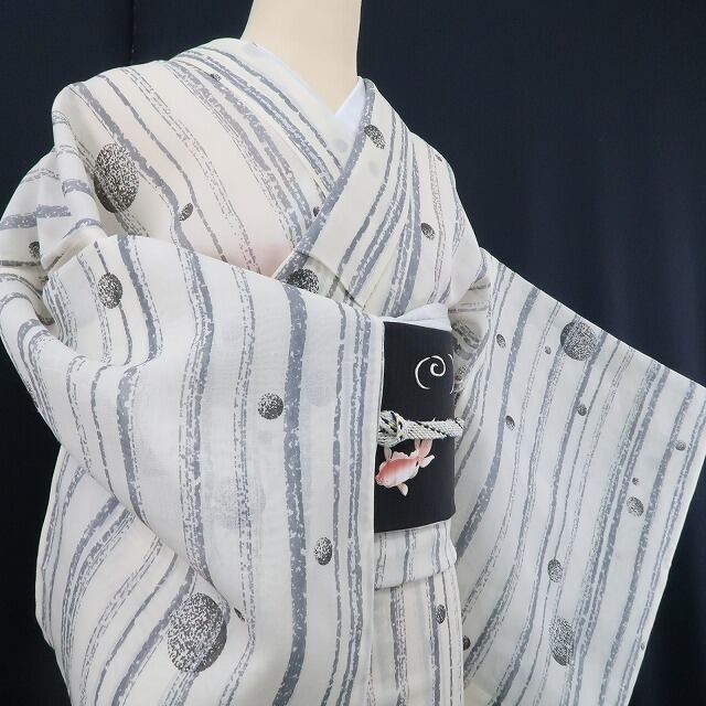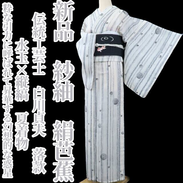 新品 紗紬 伝統工芸士 白川貞夫 落款 水玉×縦縞 夏着物 正絹 仕付け糸付“引力に呼ばれて昇華する幻想的な惑星”絹芭蕉 3791